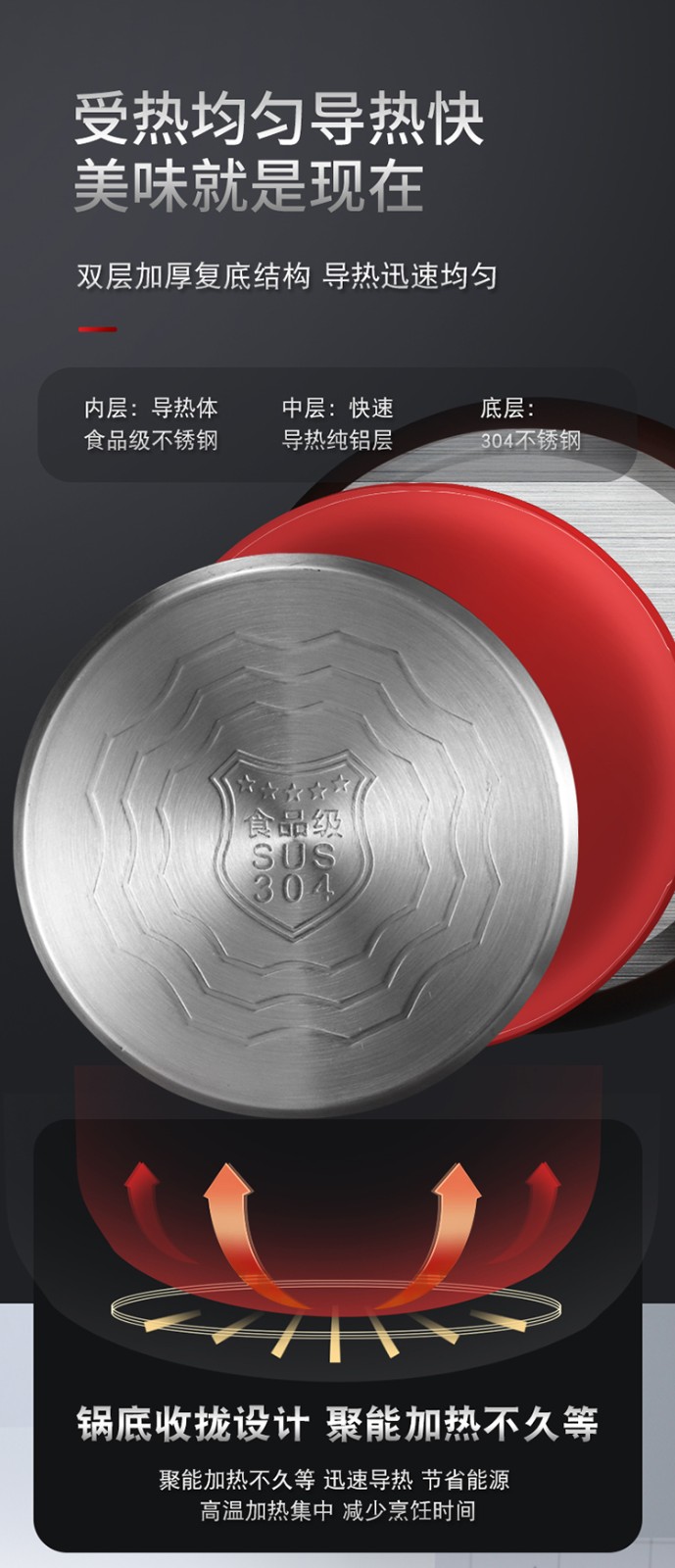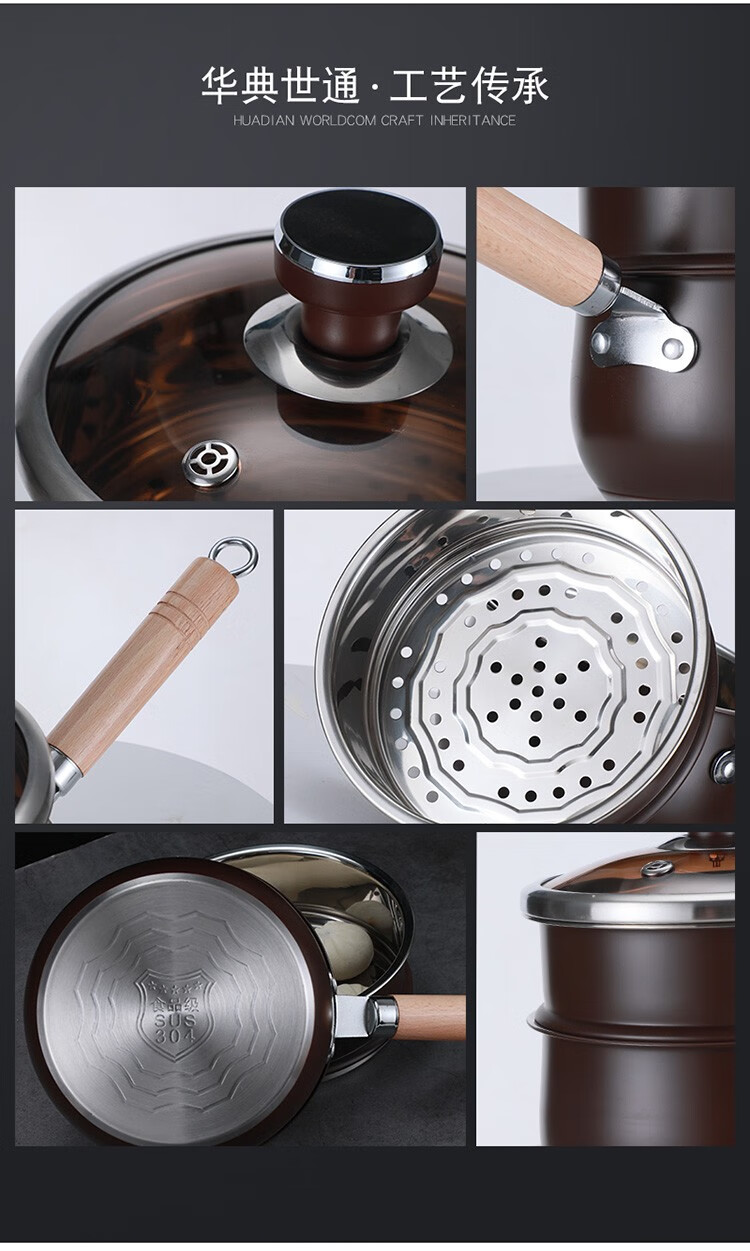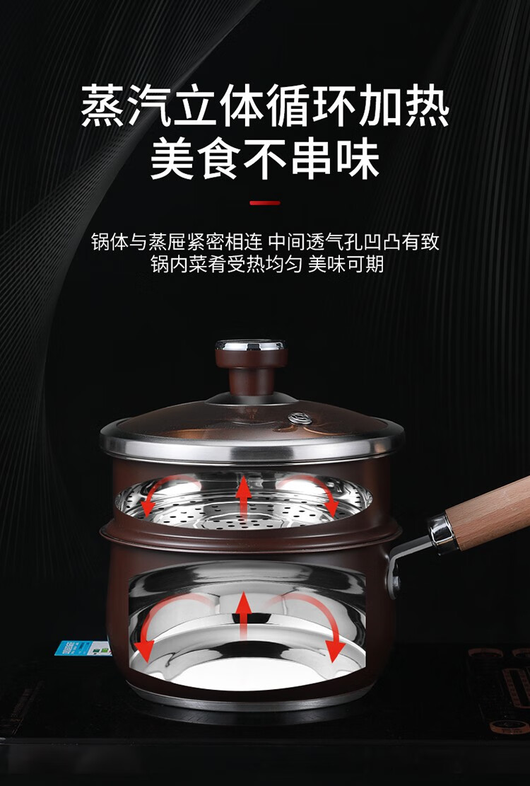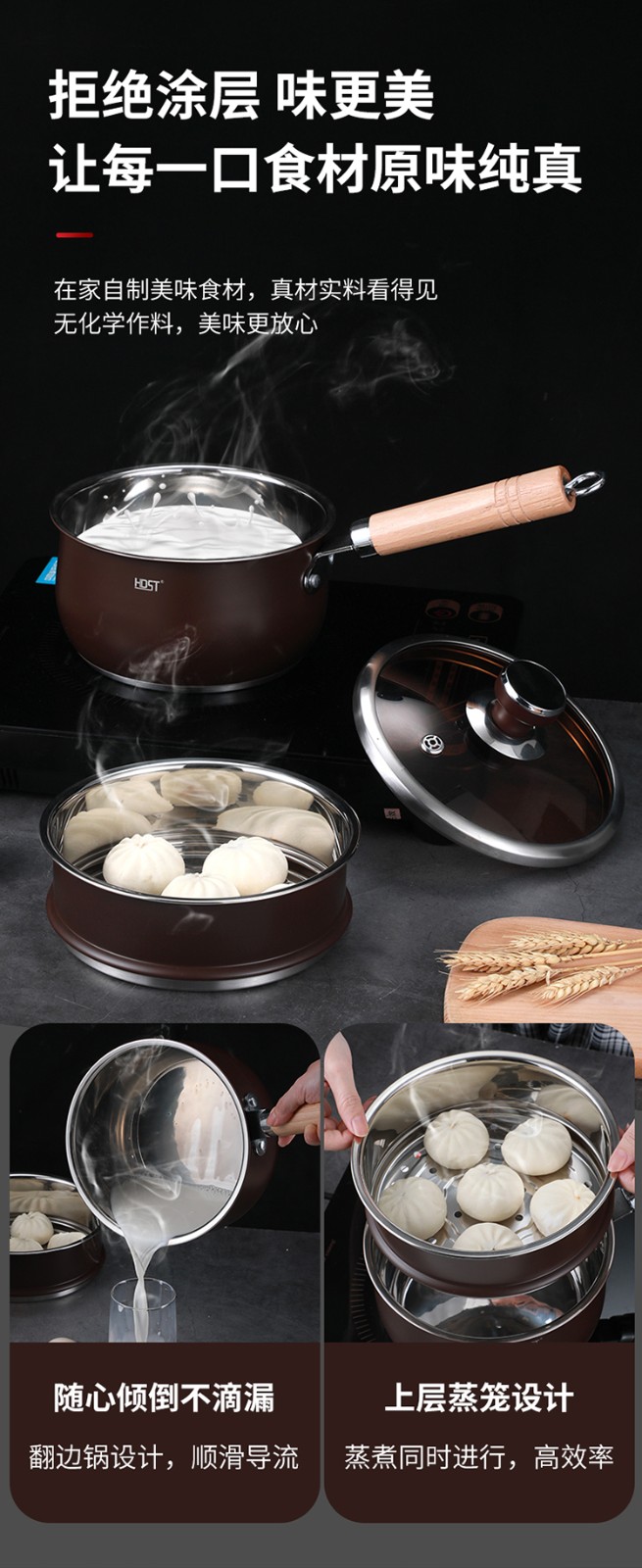 產(chǎn)品特點(diǎn):  產(chǎn)品使用食品級(jí)304不銹鋼材料,上蒸下煮。木質(zhì)防滑手柄,防燙,耐用舒適。上蓋采用鋼化可視玻璃蓋,鍋蓋采用定時(shí)溫顯鍋珠。