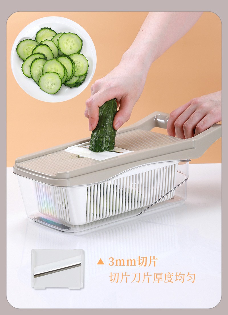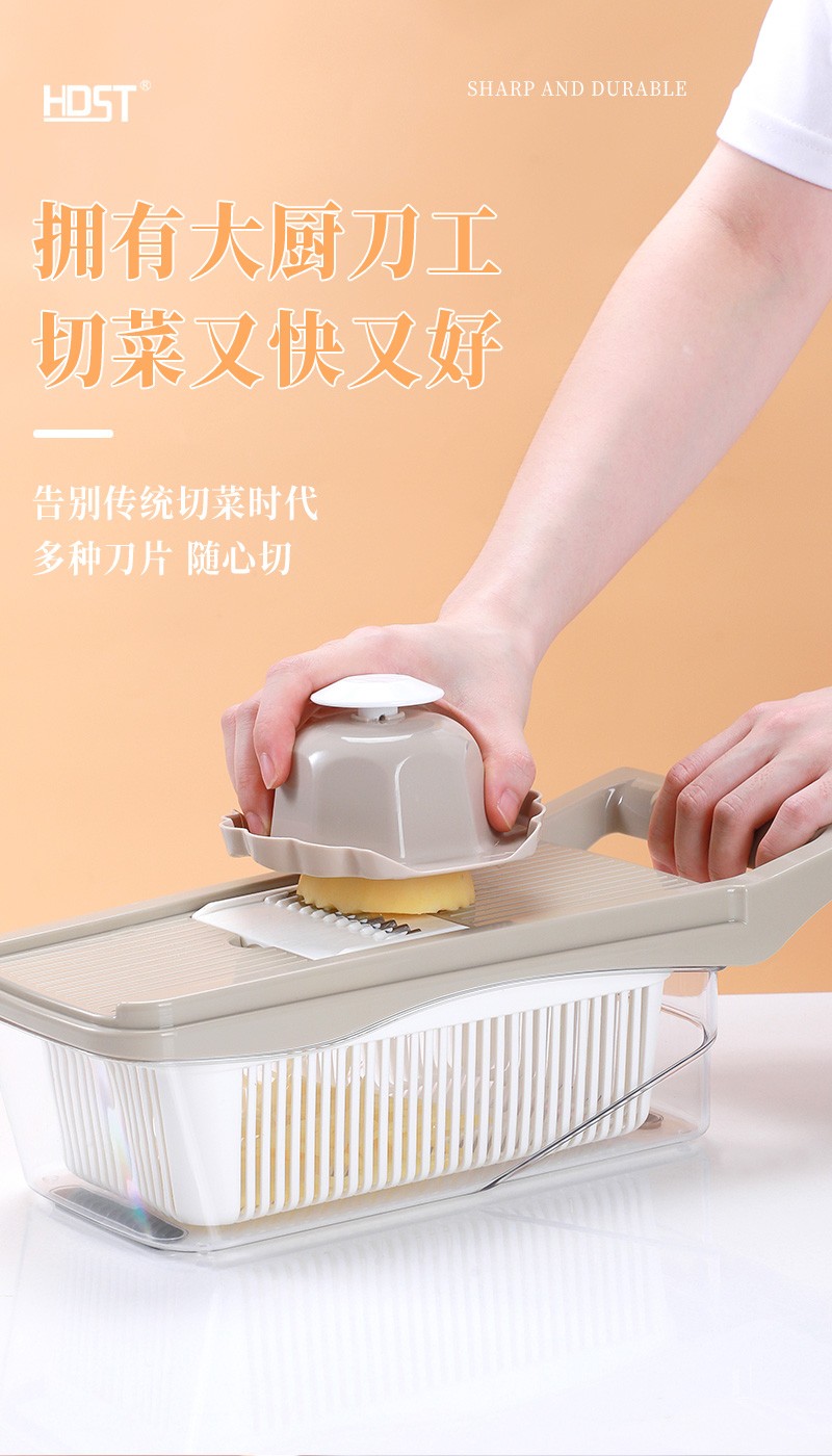 產(chǎn)品特點(diǎn): PP塑料材質(zhì)+不銹鋼,集多種功能配件,多種切菜方式于一體,滿足多種廚房烹飪需求。