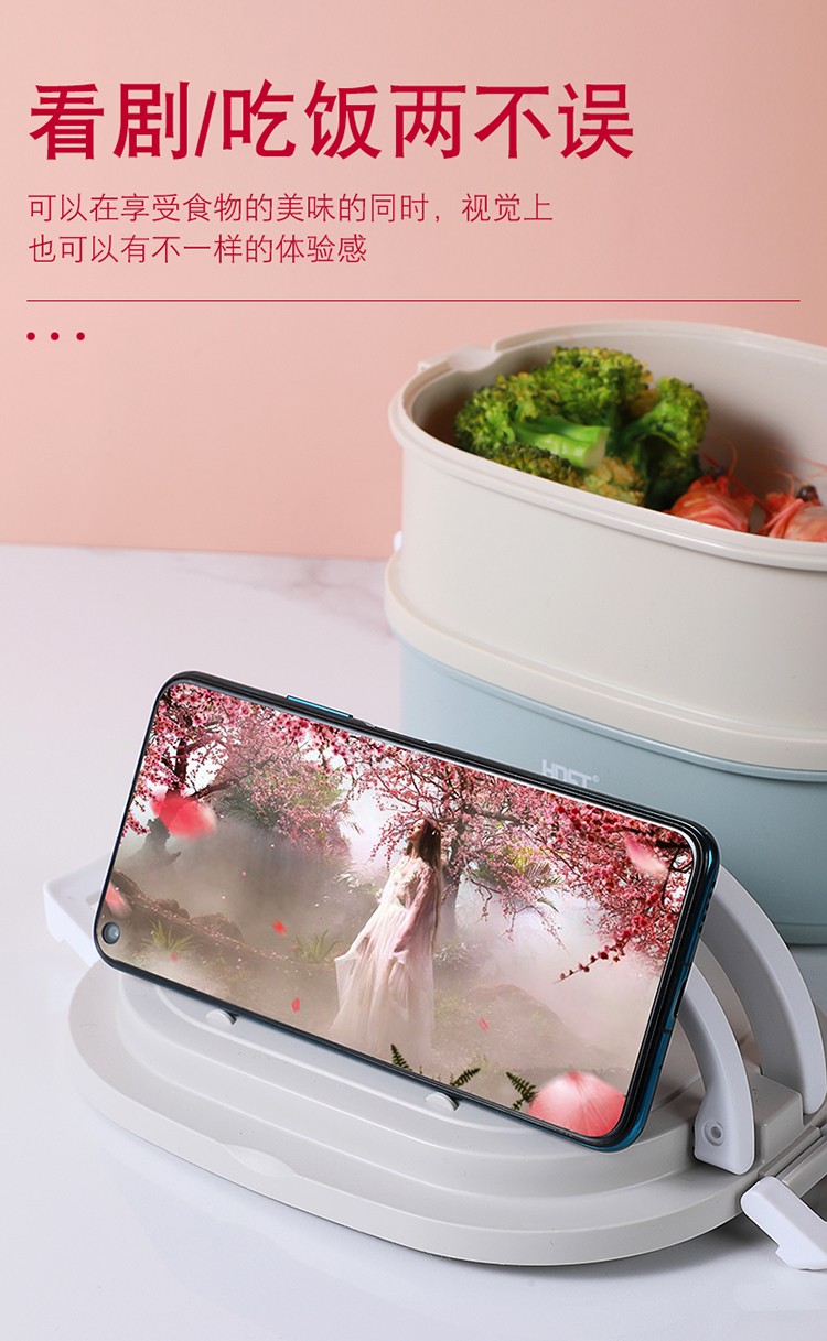 產(chǎn)品特點(diǎn): .食品級(jí)PP塑料材質(zhì),雙層便當(dāng)盒,單層容量950ml ,隱藏式手提多功能蓋子,可當(dāng)手機(jī)支架。鎖扣設(shè)計(jì)嚴(yán)密,牢固不脫落。 配套便攜餐具勺筷套裝,干凈衛(wèi)生。