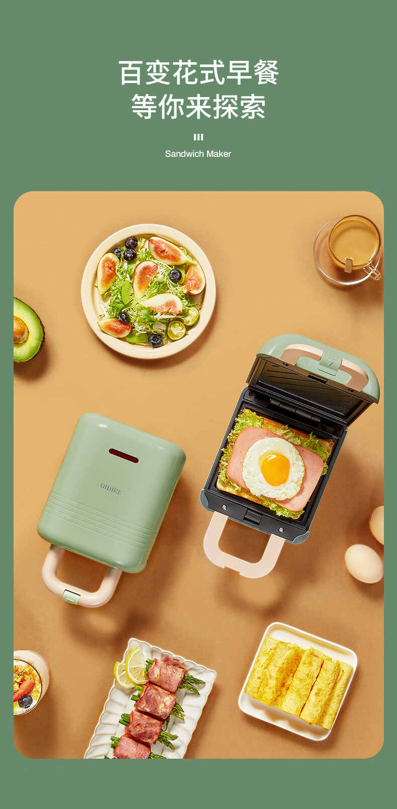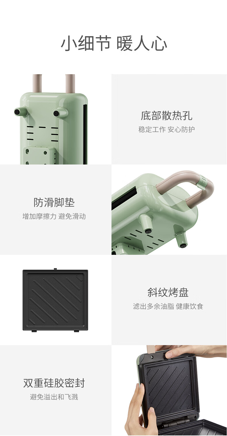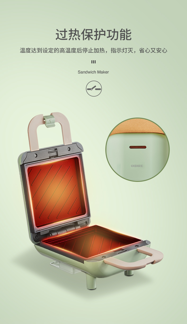 德國 OIDIRE 電餅鐺 三明治機(jī) 家用早餐機(jī) 華夫餅機(jī) 可拆洗輕食機(jī) 雙面壓烤機(jī)華夫餅機(jī) ODI-SMZ01 松柏綠 標(biāo)準(zhǔn)款 自營