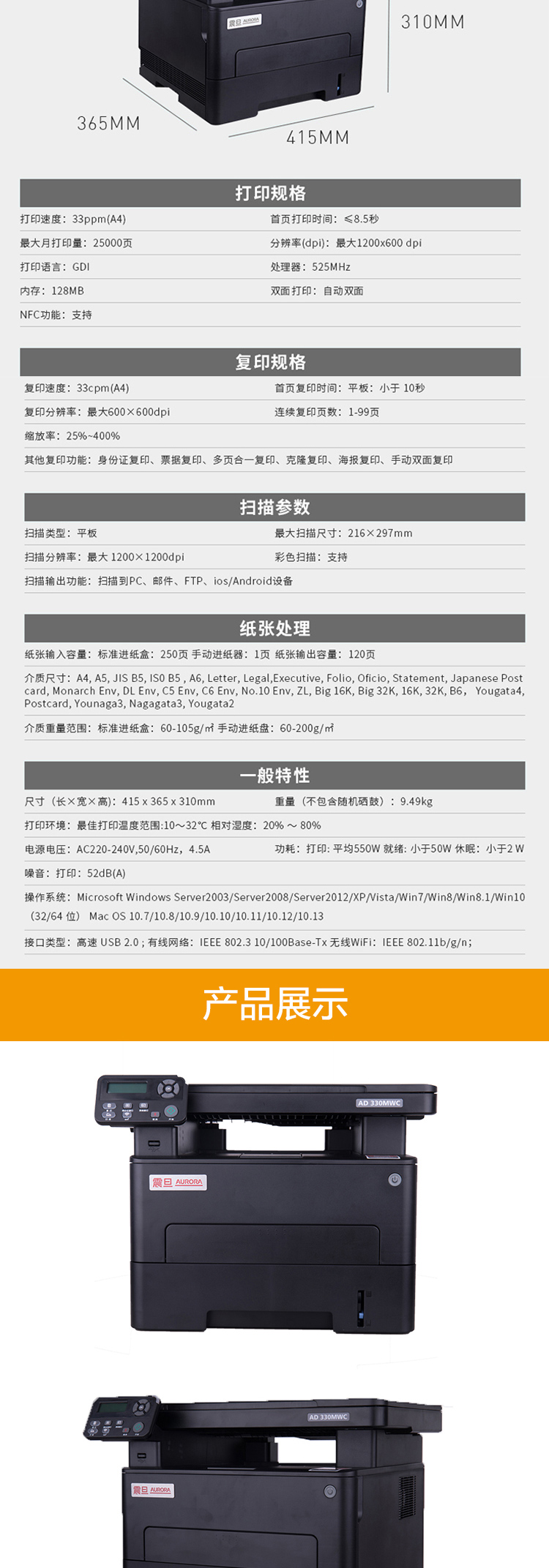 震旦(AURORA)AD330MWC 黑白激光一體機(jī)(復(fù)印/打印/掃描) 工業(yè)設(shè)備 A4打印機(jī)(企業(yè)版) 自營(yíng)