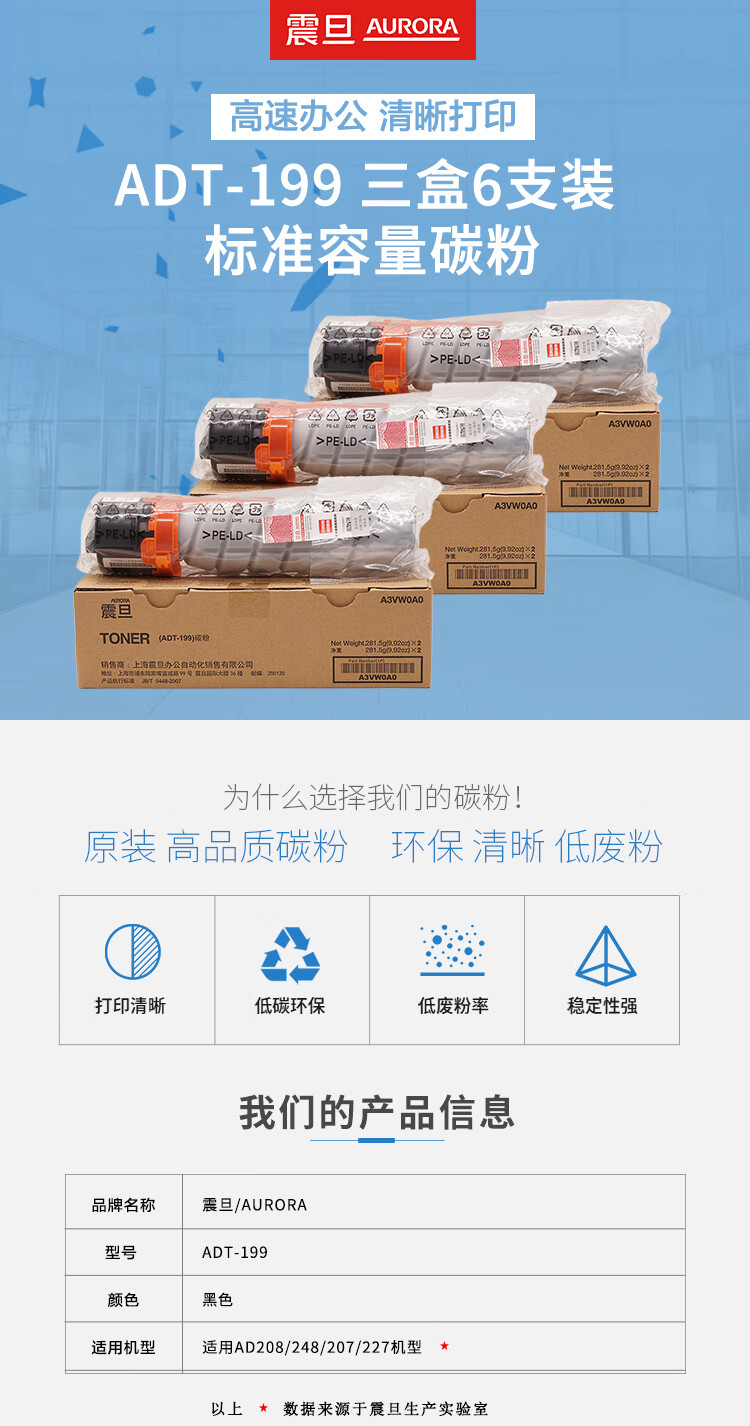 震旦(AURORA)ADT-199 標準容量碳粉 三盒6支裝 (適用AD208/228/248/207/227機型) 自營