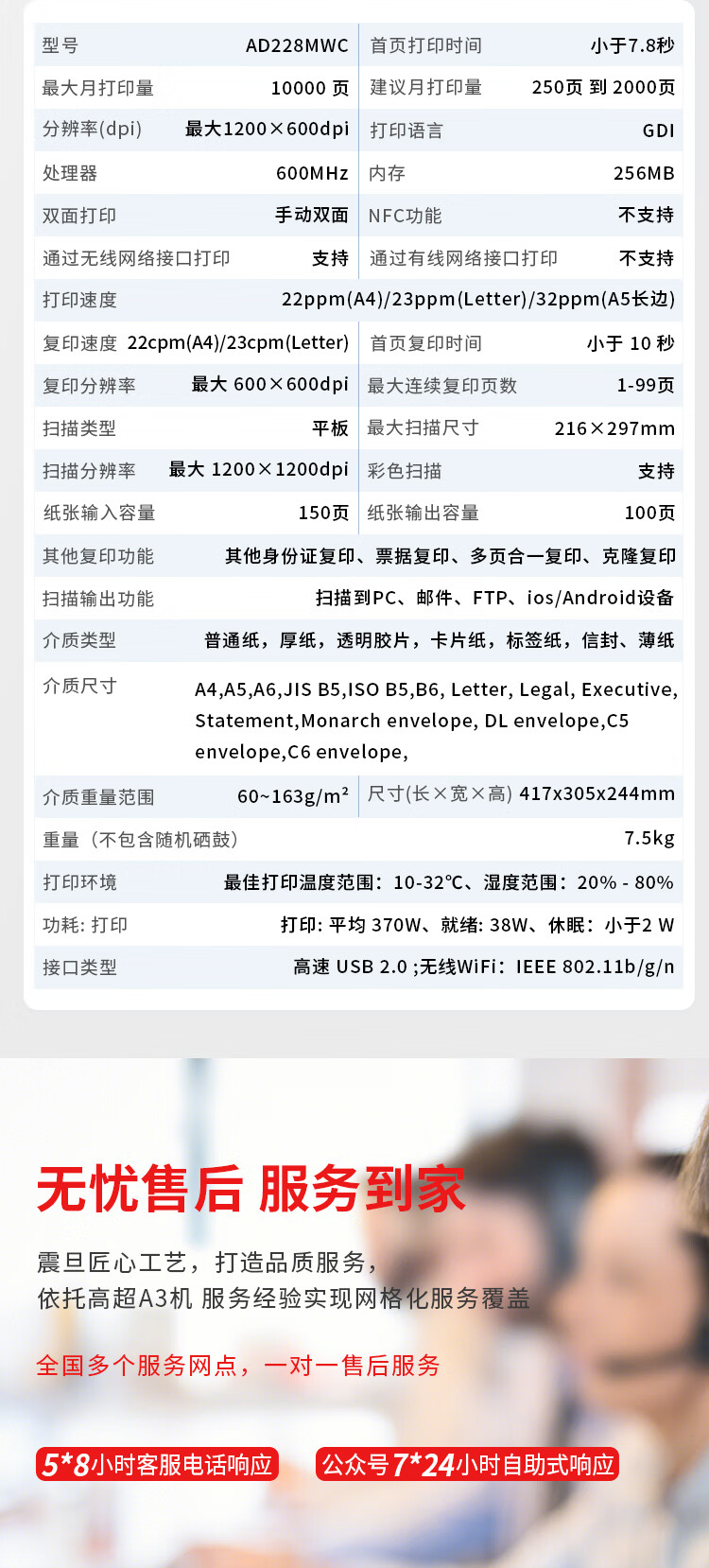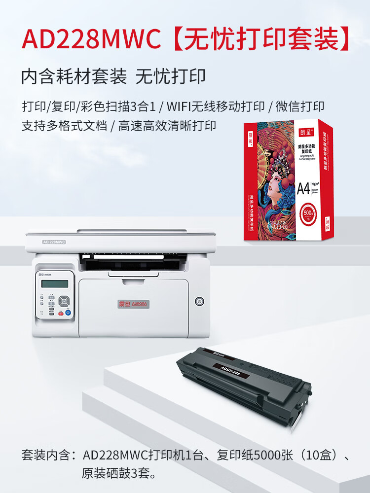 震旦(AURORA)AD228MWC黑白激光無線家用一體機(jī) 一年無憂打?。ê?800頁耗材+A4紙?zhí)籽b) 自營