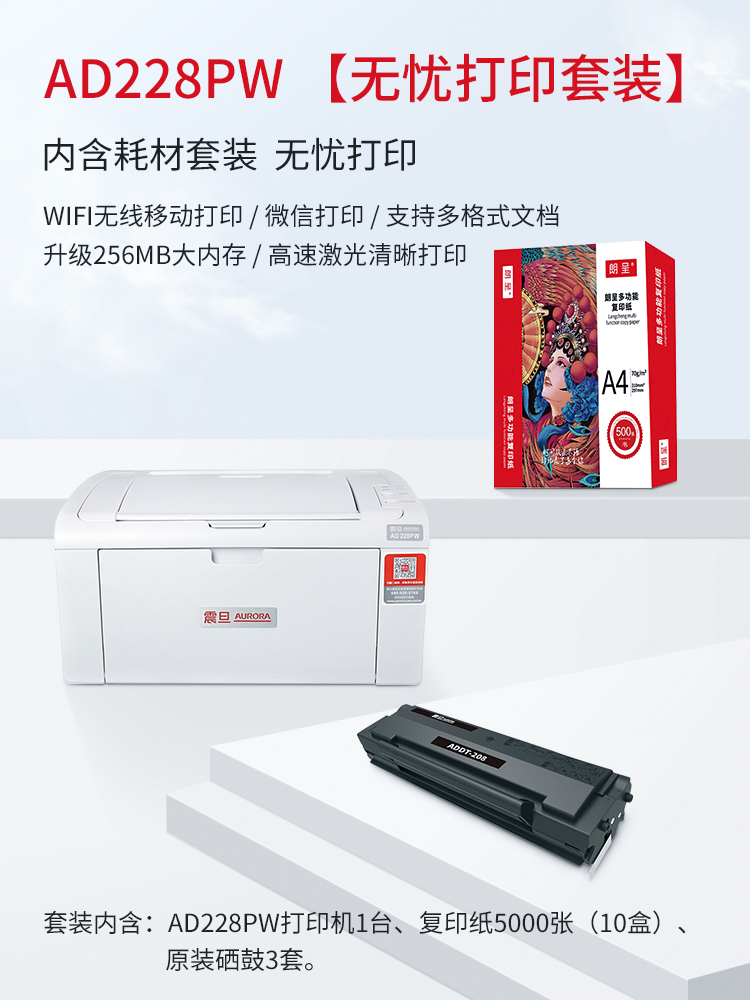 震旦(AURORA)AD228PW黑白激光無線家用打印機(jī) 一年無憂打?。ê?800頁耗材+A4紙?zhí)籽b) 自營