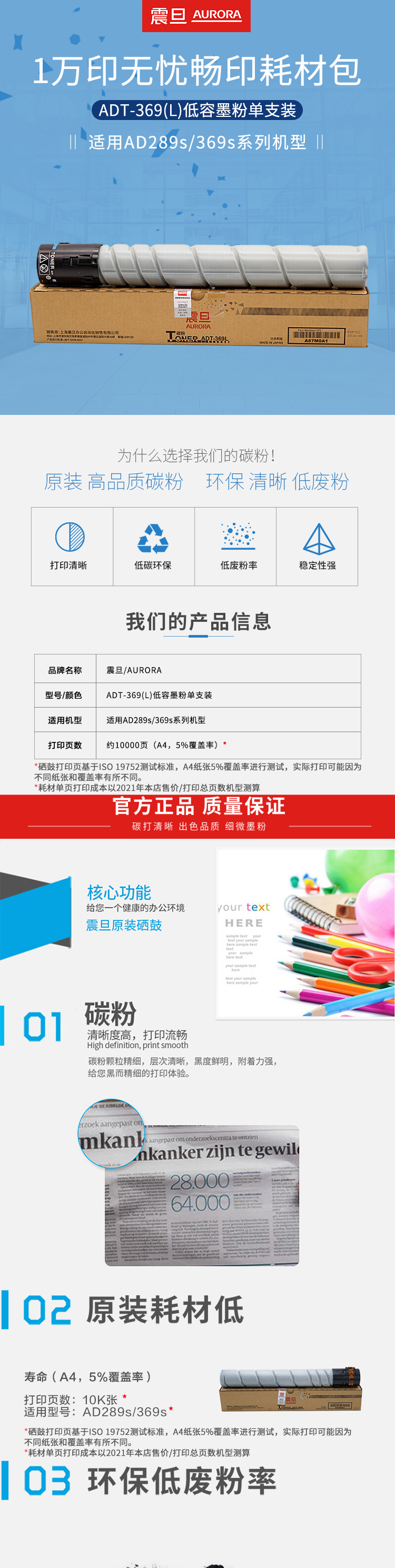 震旦(AURORA)AD289s 1萬(wàn)印無(wú)憂暢印耗材包 ADT-369(L)低容墨粉單支裝 自營(yíng)