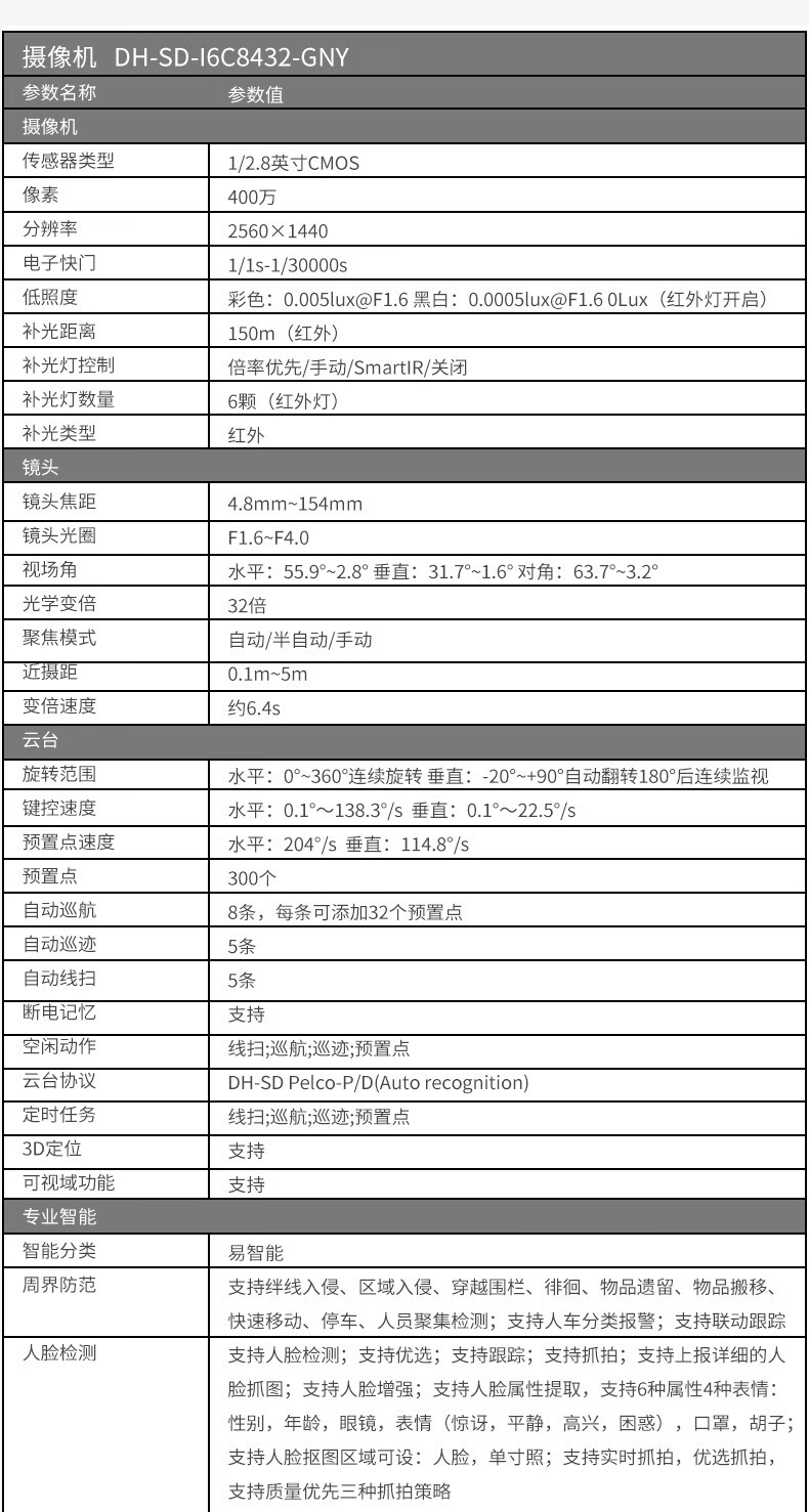 dahua大華監(jiān)控智能網(wǎng)絡(luò)球機(jī) 400萬星光級夜視32倍變焦云臺旋轉(zhuǎn)球機(jī) DH-SD-I6C8432-GNY 自營