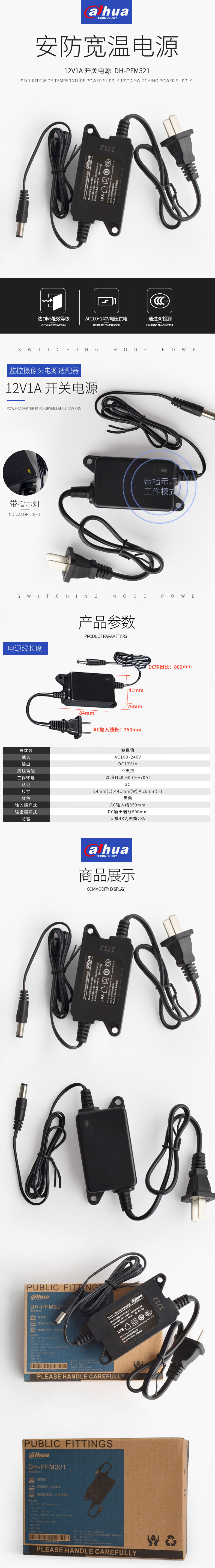 dahua 大華12V1A電源適配器DC5.5*2.1mm直流開關(guān)變壓器 室內(nèi)1A壁掛式電源適配器 DH-PFM321 自營