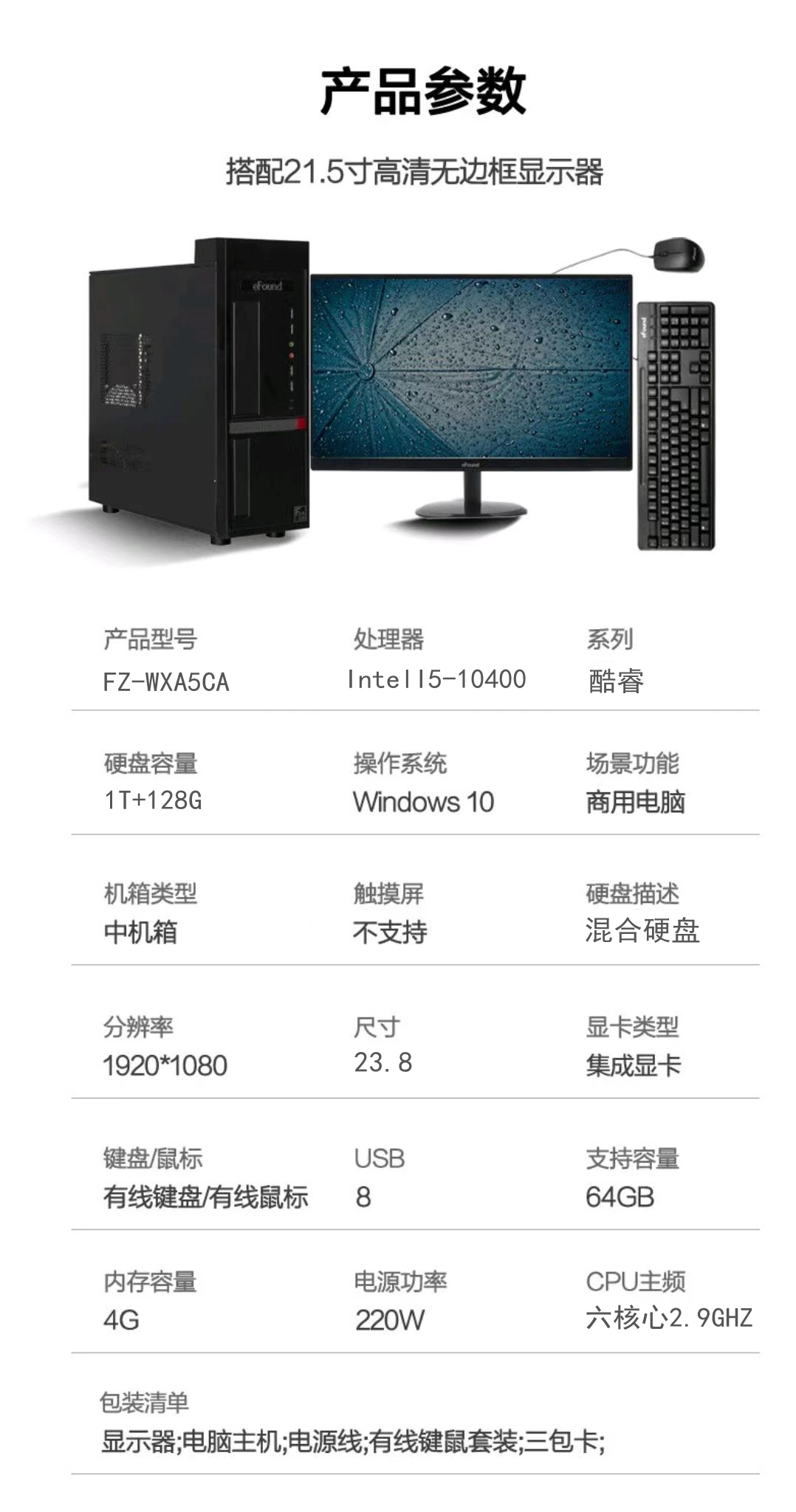 方正/eFound文祥臺(tái)式機(jī)FZ-WXA5CA英特爾酷睿I510400/4G/128SSD+1T/23.8LED 自營(yíng)
