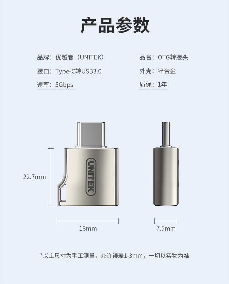 優(yōu)越者(UNITEK)Type-C轉USB3.0轉接頭 OTG數據線 蘋果Ipad Pro華為小米三星手機平板筆記本轉換線 Y-A025GNI 自營