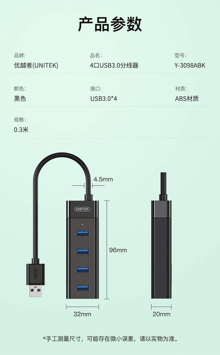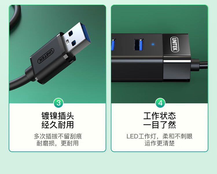 優(yōu)越者(UNITEK)USB分線器3.0高速4口擴(kuò)展塢筆記本臺(tái)式電腦一拖四hub集線器usb延長(zhǎng)線0.3米帶供電口 Y-3098ABK 自營(yíng)
