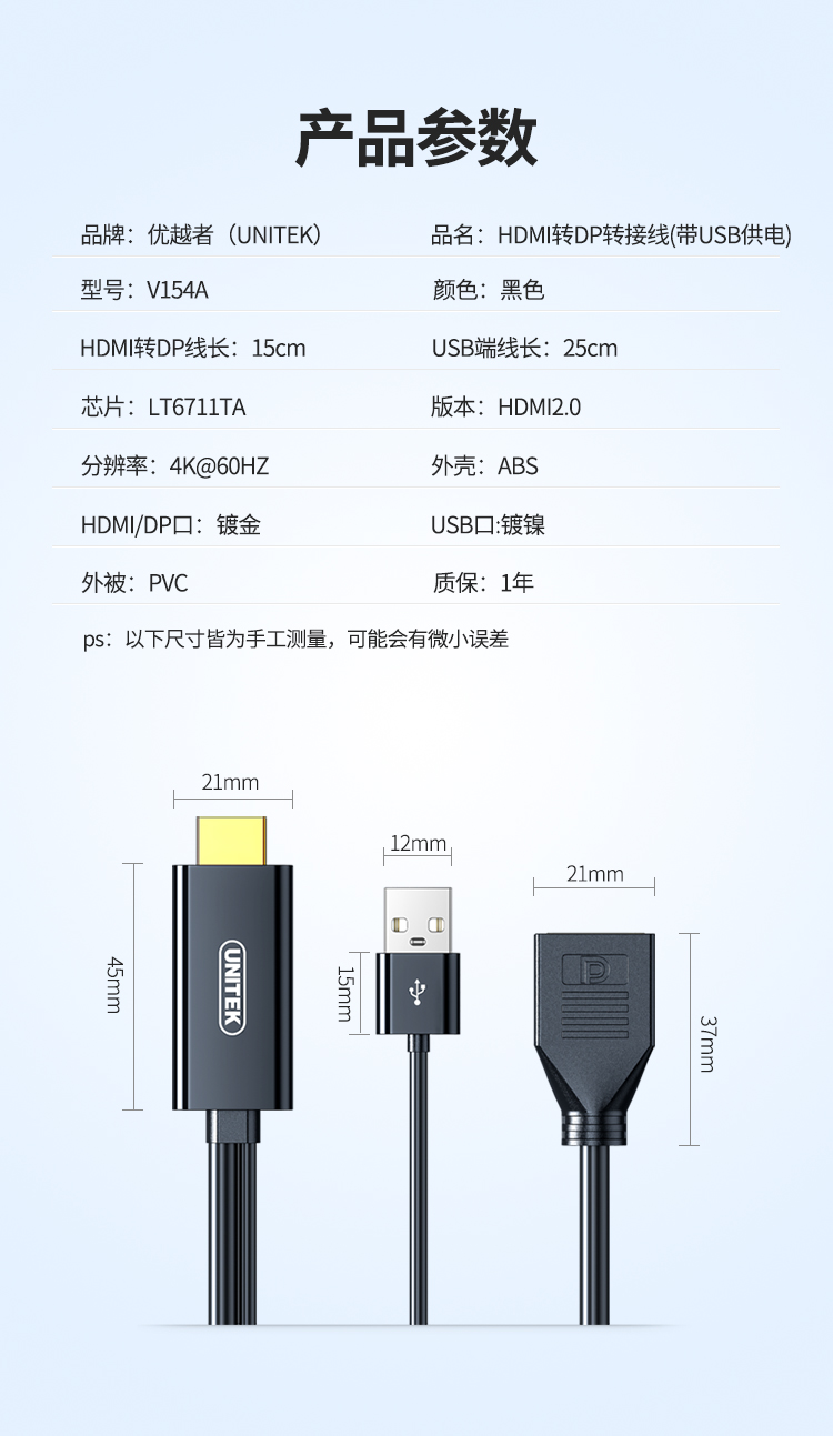 優(yōu)越者(UNITEK)HDMI轉(zhuǎn)DP轉(zhuǎn)換器 4K60Hz HDMI公Displayport母4K高清視頻線 筆記本電腦PS4接顯示器轉(zhuǎn)接頭V154A 自營(yíng)