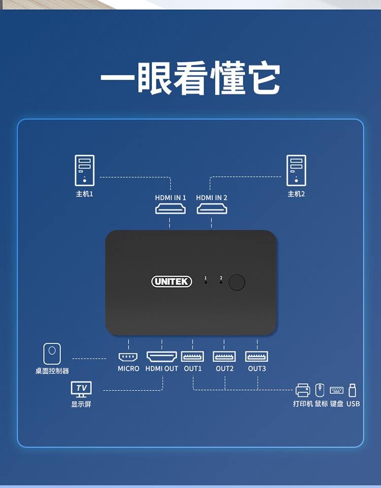 優(yōu)越者(UNITEK)KVM切換器HDMI2.0切屏器2進(jìn)1出 4K高清3D視頻 筆記本機(jī)頂盒接電視投影儀共享顯示器 V148A 自營