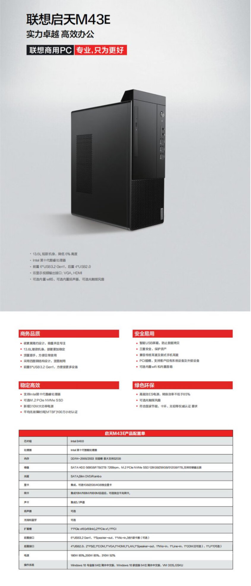 聯(lián)想 Lenovo 啟天M43E-A011 i5-10500/8GB/1TB/集成顯卡/無光驅/Win10 home 自營