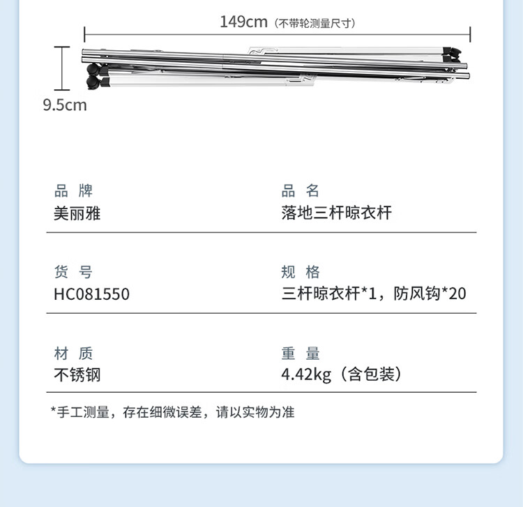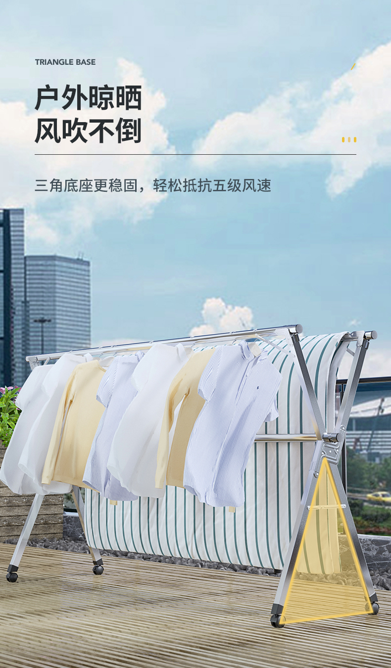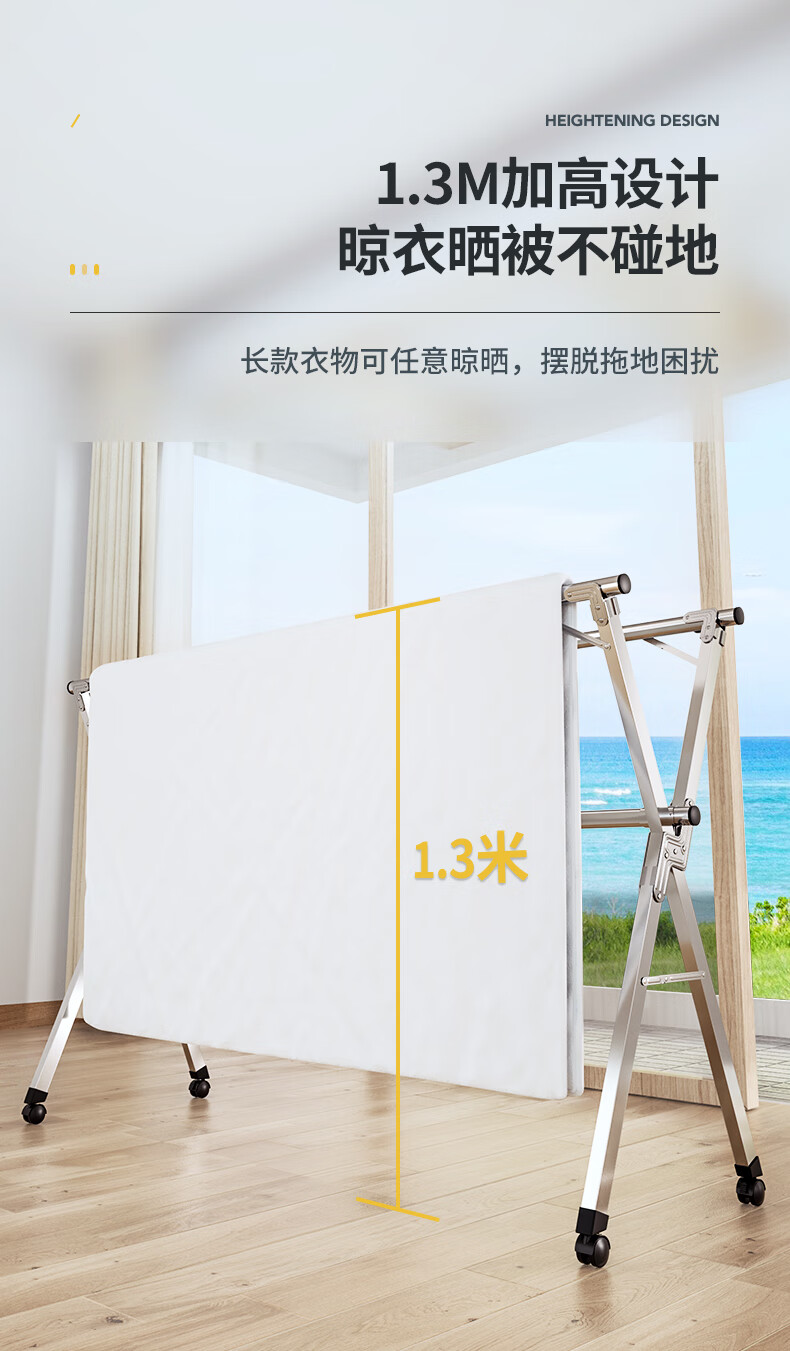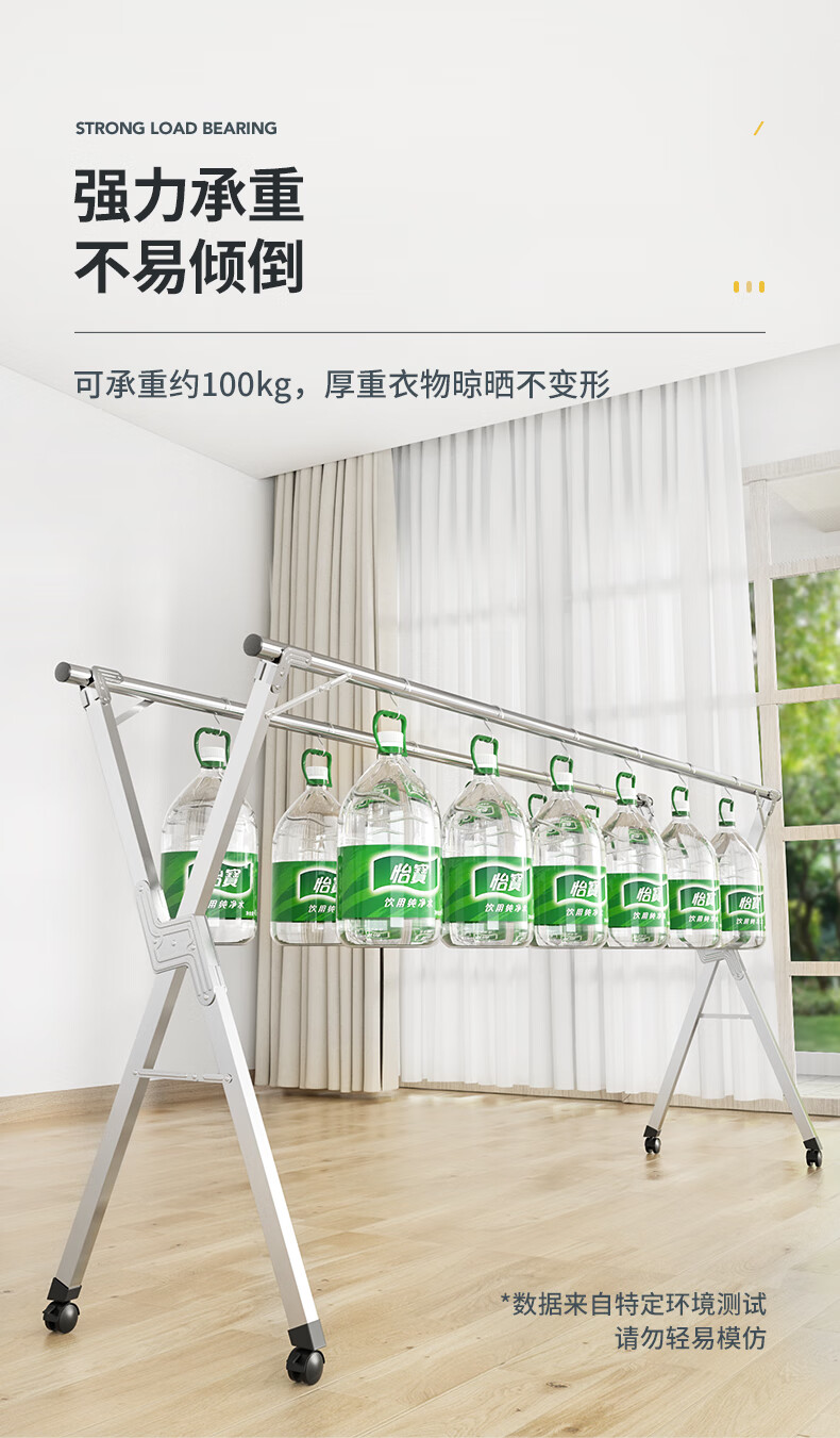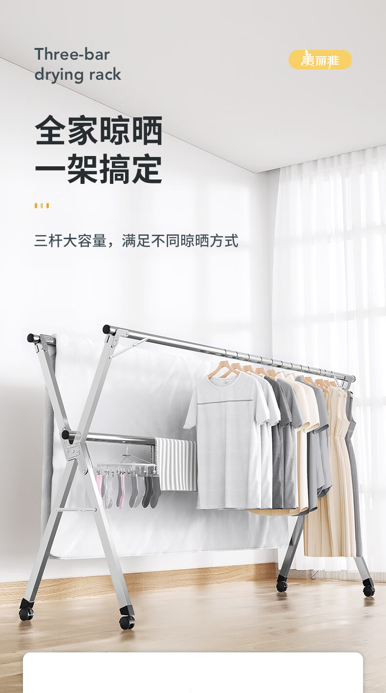 美麗雅 落地晾衣架 衣架 三桿不銹鋼可折疊晾衣桿掛衣架陽臺落地衣架曬架室內(nèi)外2米可伸縮免安裝帶滑輪 自營