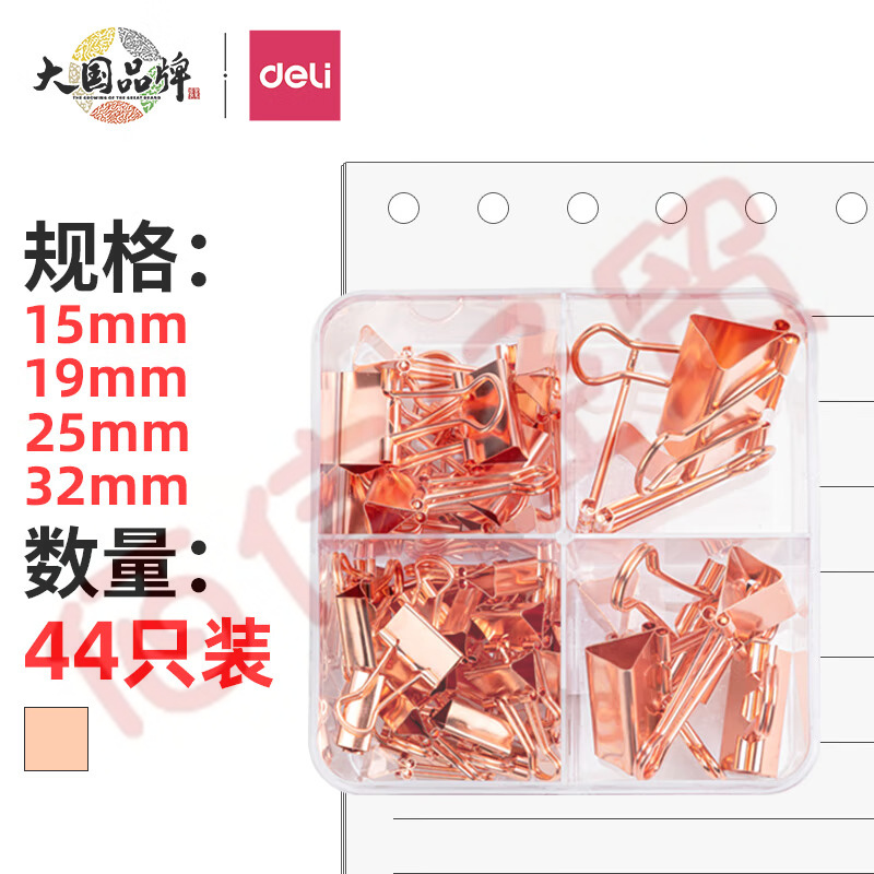 得力(deli)-44只-玫瑰金長尾夾-組合裝(32mm*2只+25mm*5只+19mm*12只+15mm*25只) -78205 (每包4盒) 自營