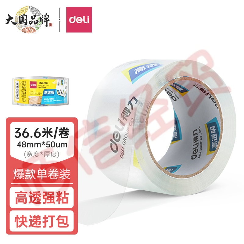 得力(deli)高品質(zhì)高透明封箱膠帶打包膠帶 48mm*40y*50um(36.6m/卷) 1卷裝 辦公用品 30246 自營