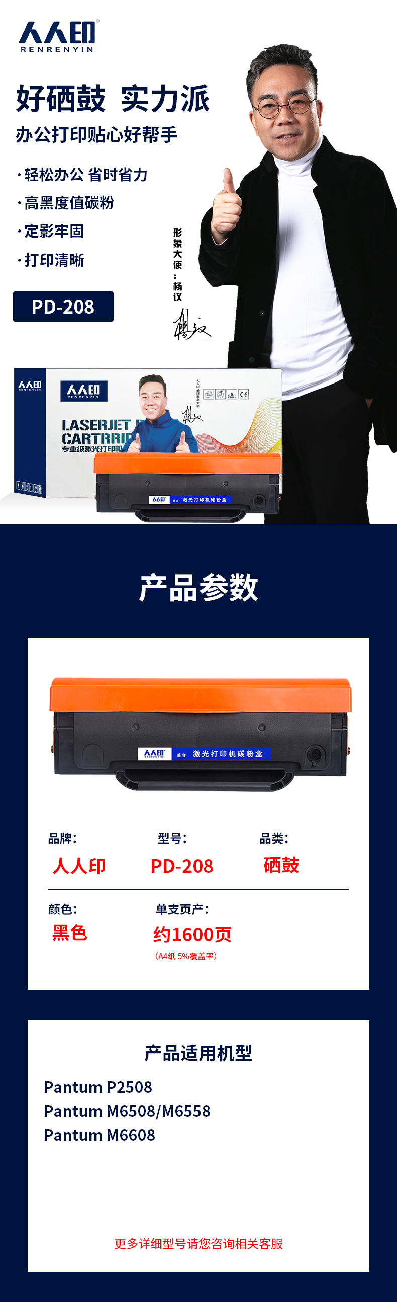 人人印 PD-208易加粉硒鼓 適用奔圖PantumP2508激光打印機M6508粉盒M6558墨盒M6608碳粉黑色硒鼓 自營