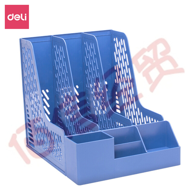 得力(deli)三聯(lián)帶筆筒收納桌面文件框 多功能鏤空文件欄/文件框/資料筐 藍(lán)色 自營