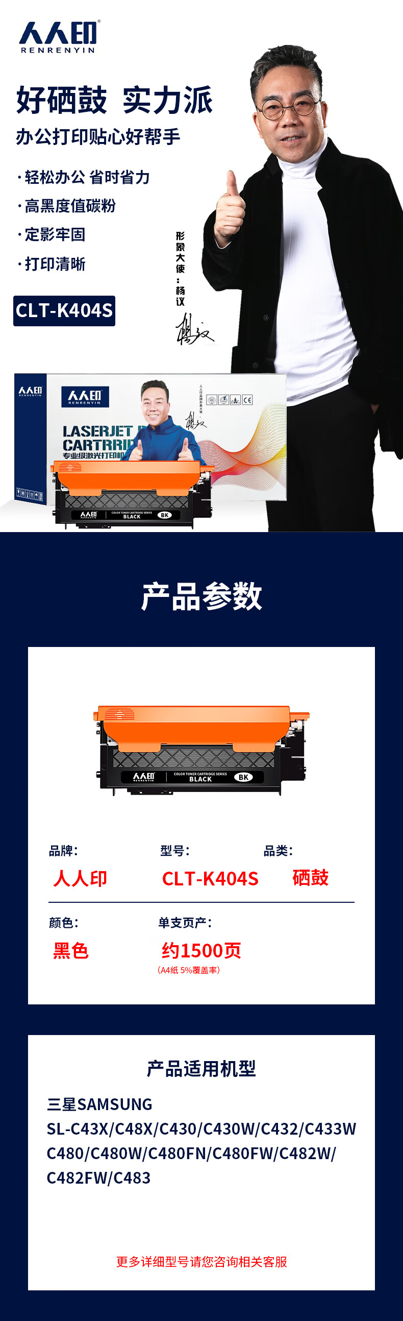 人人印 CLT-K404S黑色硒鼓適用三星SL-C430W/C430/C432W2/C433W/480FW/C480/C480FN/C482W打印機(jī)粉盒 自營