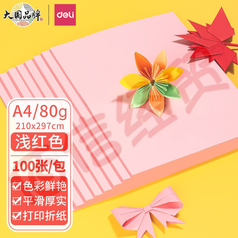 得力(deli)A4 80g淺紅色粉紅復印紙 彩色打印紙 兒童手工折紙剪紙彩紙 非硬卡紙 100張/包 7757 自營