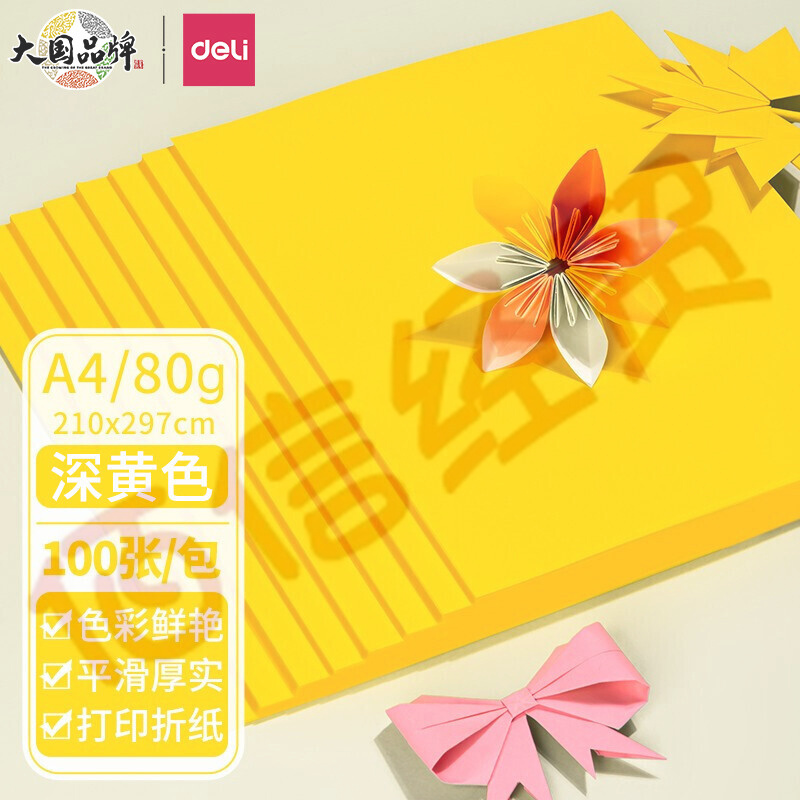 得力(deli)A4 80g黃色復(fù)印紙 彩色打印紙 兒童手工折紙剪紙彩紙 非硬卡紙 100張/包 7758 自營(yíng)
