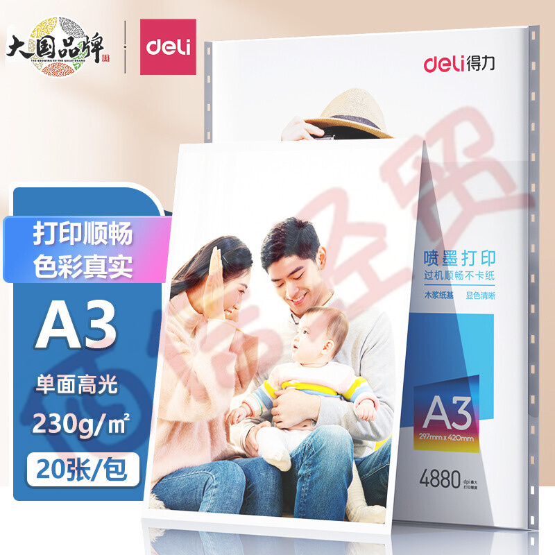 得力(deli)A3 230g高光面照片紙 相片打印紙 20張/包 11823 自營