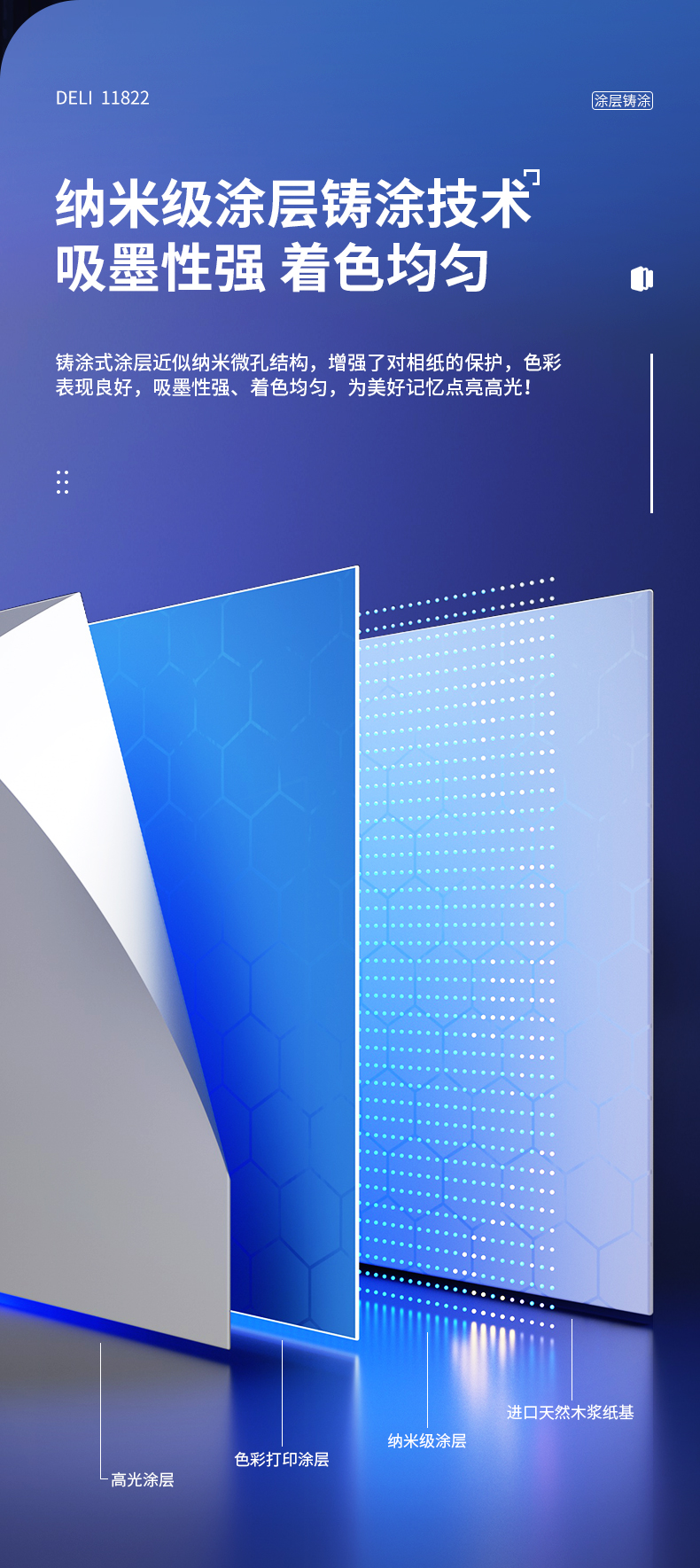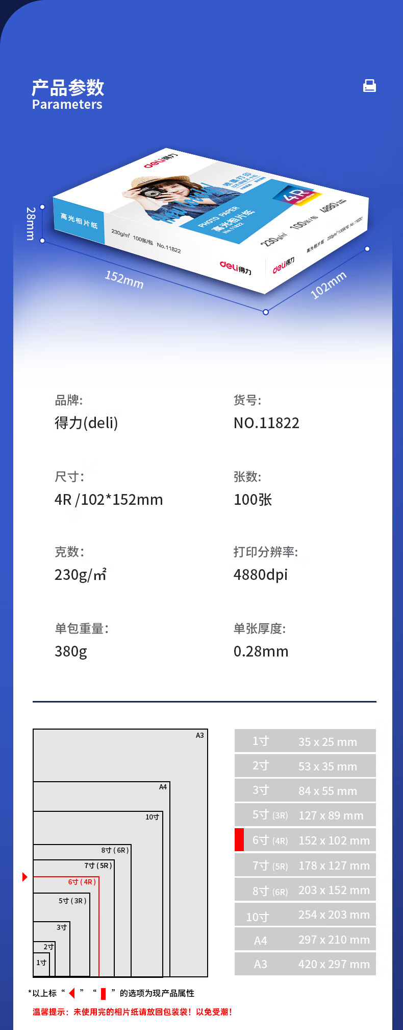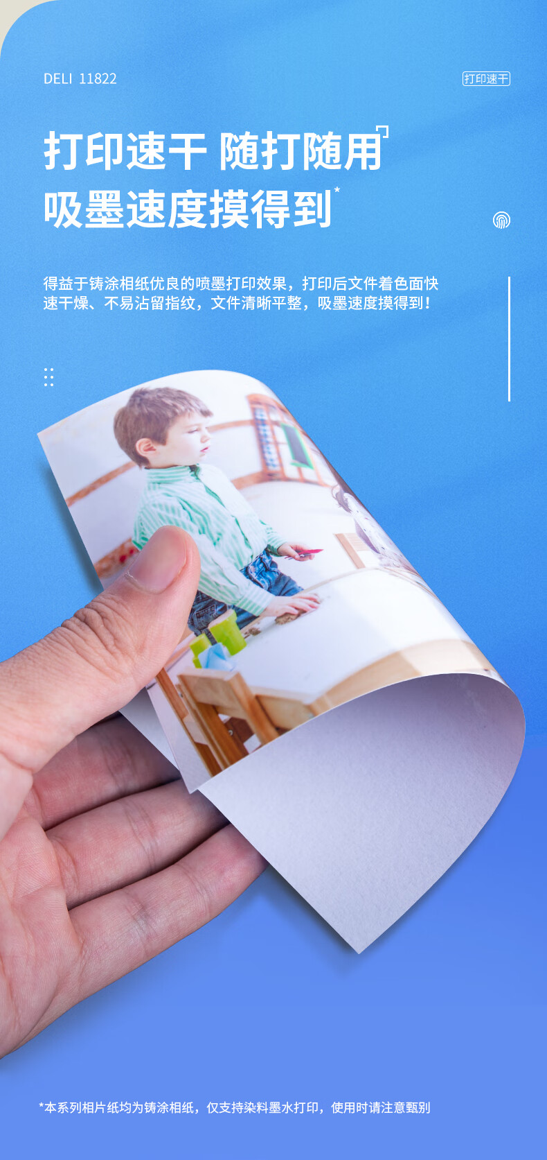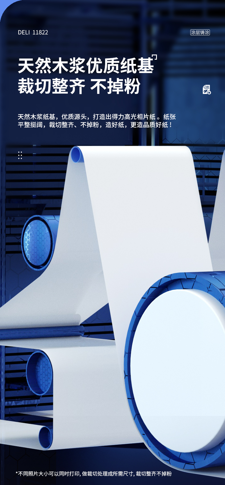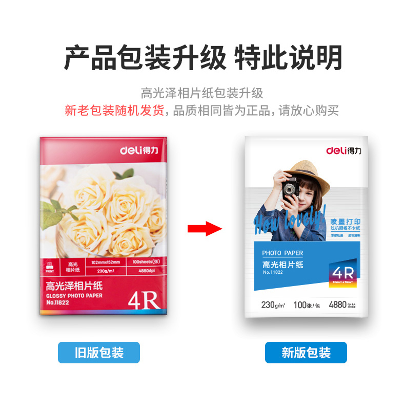 得力(deli)6英寸 230g高光面照片紙 相片打印紙 100張/包 11822 自營