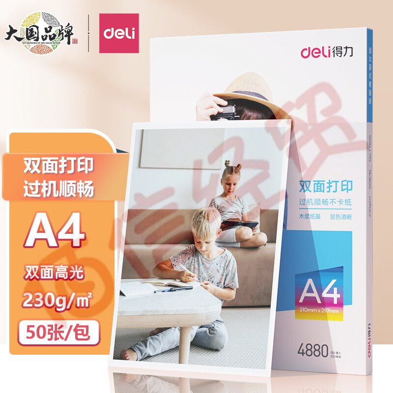 得力(deli)A4 230g雙面高光照片紙 相片打印紙 50張/盒 11826 自營(yíng)