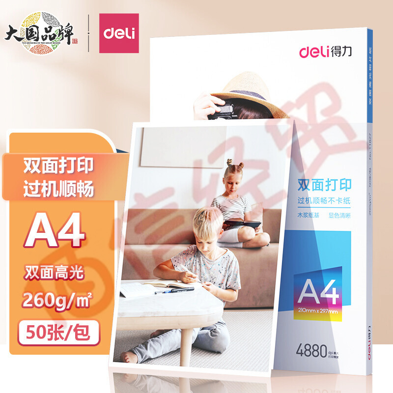 得力(deli)A4 260g雙面高光照片紙 加厚相片打印紙 50張/盒 11827 自營