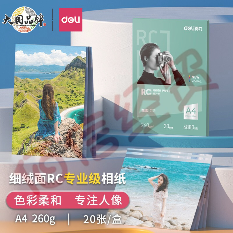 得力(deli)A4 260g細絨面RC專業(yè)相片紙 影樓專用照片打印紙 20張/盒 11843 自營