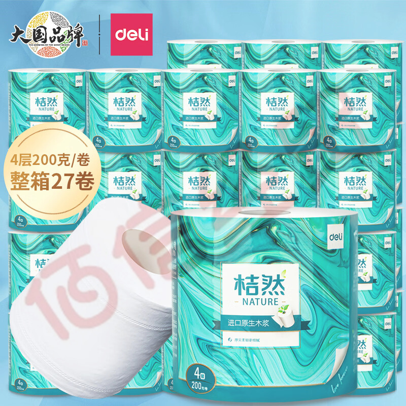 得力(deli)卷紙 加厚4層*200克*27卷 易降解衛(wèi)生卷筒紙 桔然nature系列紙巾 整箱銷售 WJ4200-01 自營