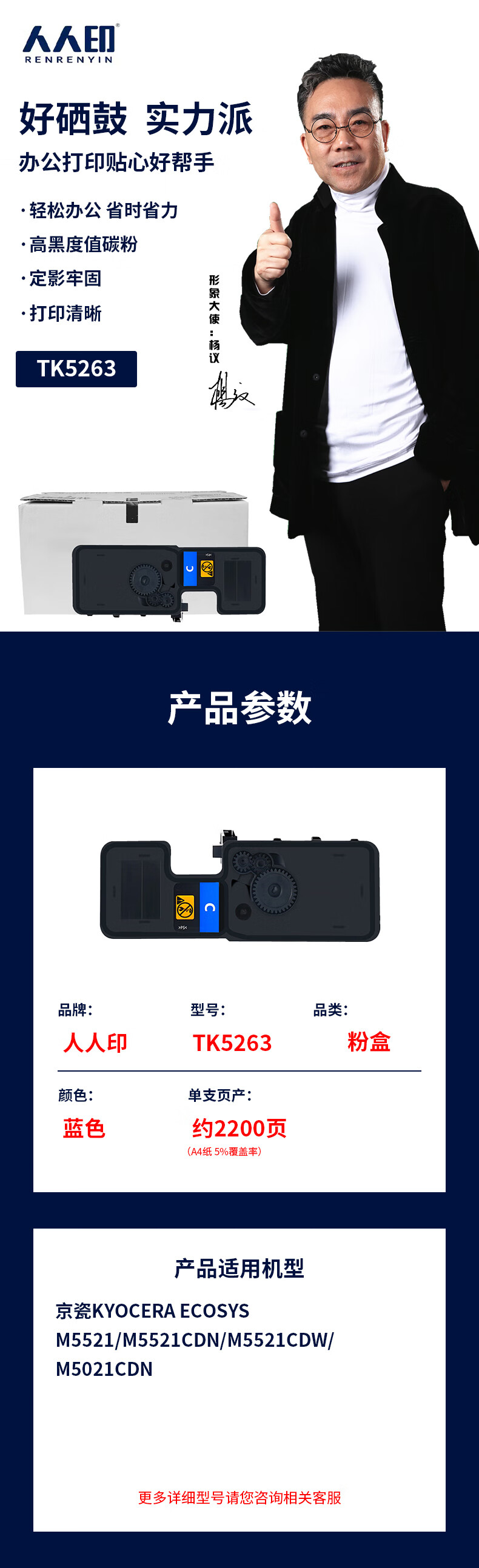 人人印TK-5253K藍(lán)色 適用京瓷Kyocera ECOSYS M5521CDW碳粉M5521CDN M5021CDN粉盒 TK5263大容量墨盒 含芯片 自營