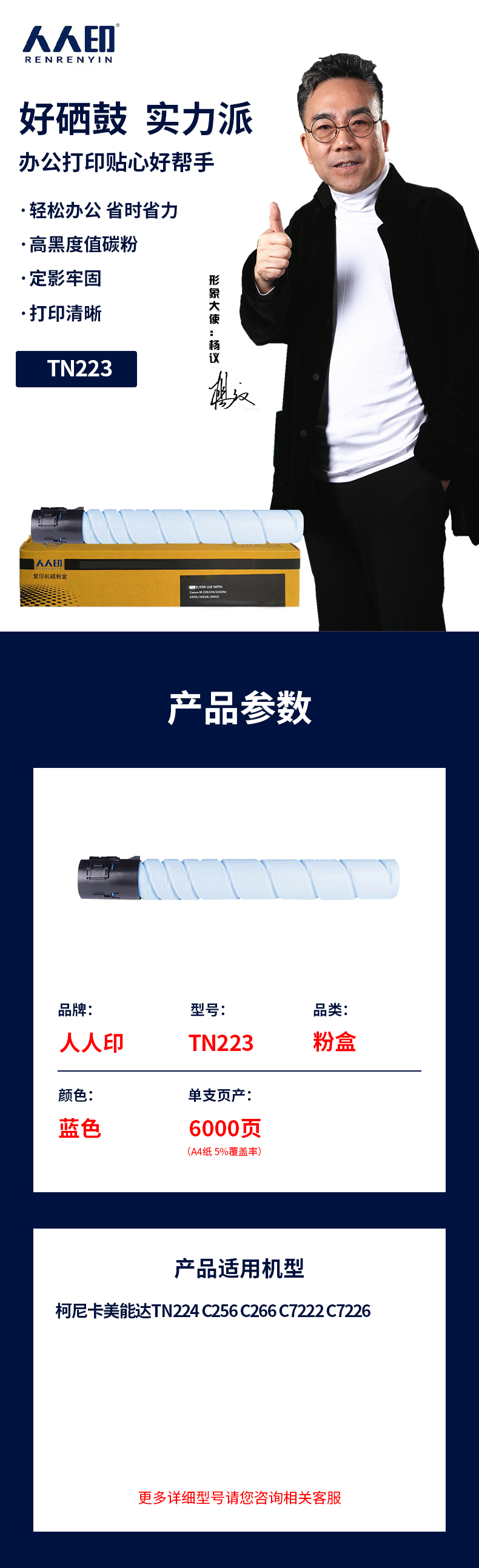 人人印 美能達(dá)TN223藍(lán)色墨粉盒 柯尼卡美能達(dá)TN224 C256 C266 C7222 C7226墨盒 柯美C226碳粉 (標(biāo)準(zhǔn)容量) 自營(yíng)