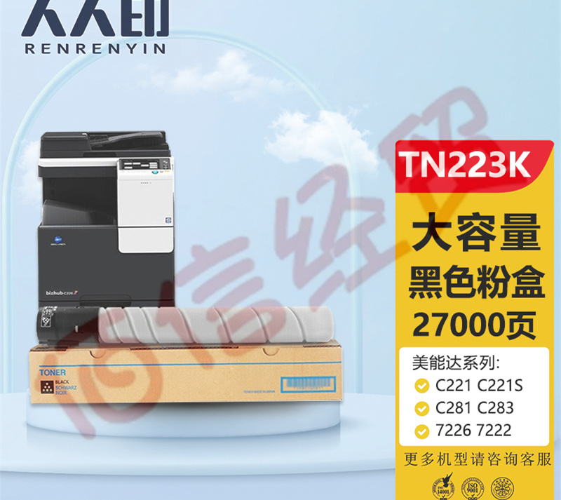 人人印 美能達(dá)TN223黑色墨粉盒 柯尼卡美能達(dá)TN224 C256 C266 C7222 C7226墨盒 柯美C226碳粉 (大容量) 自營