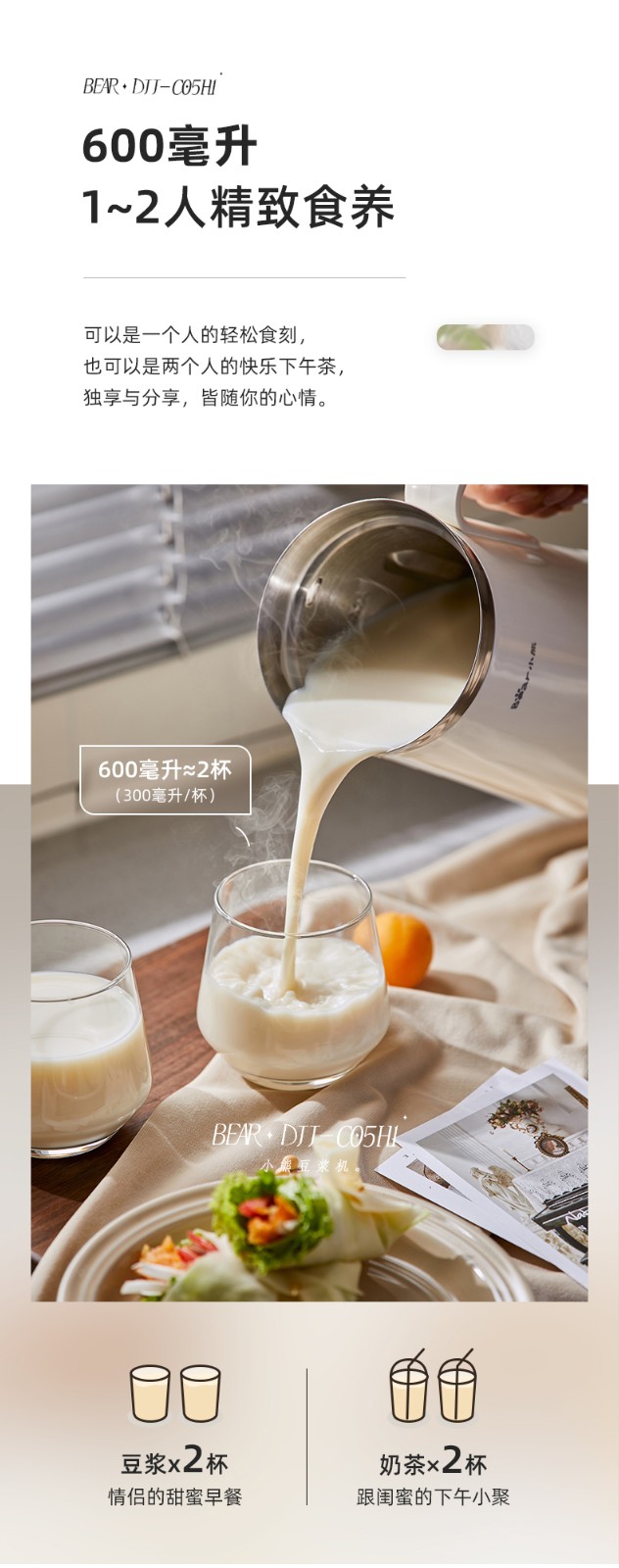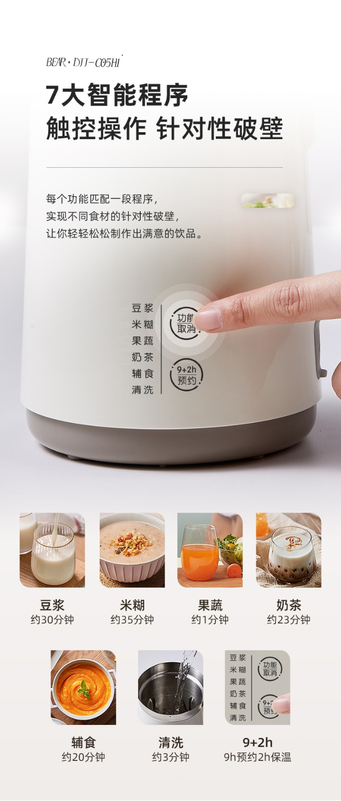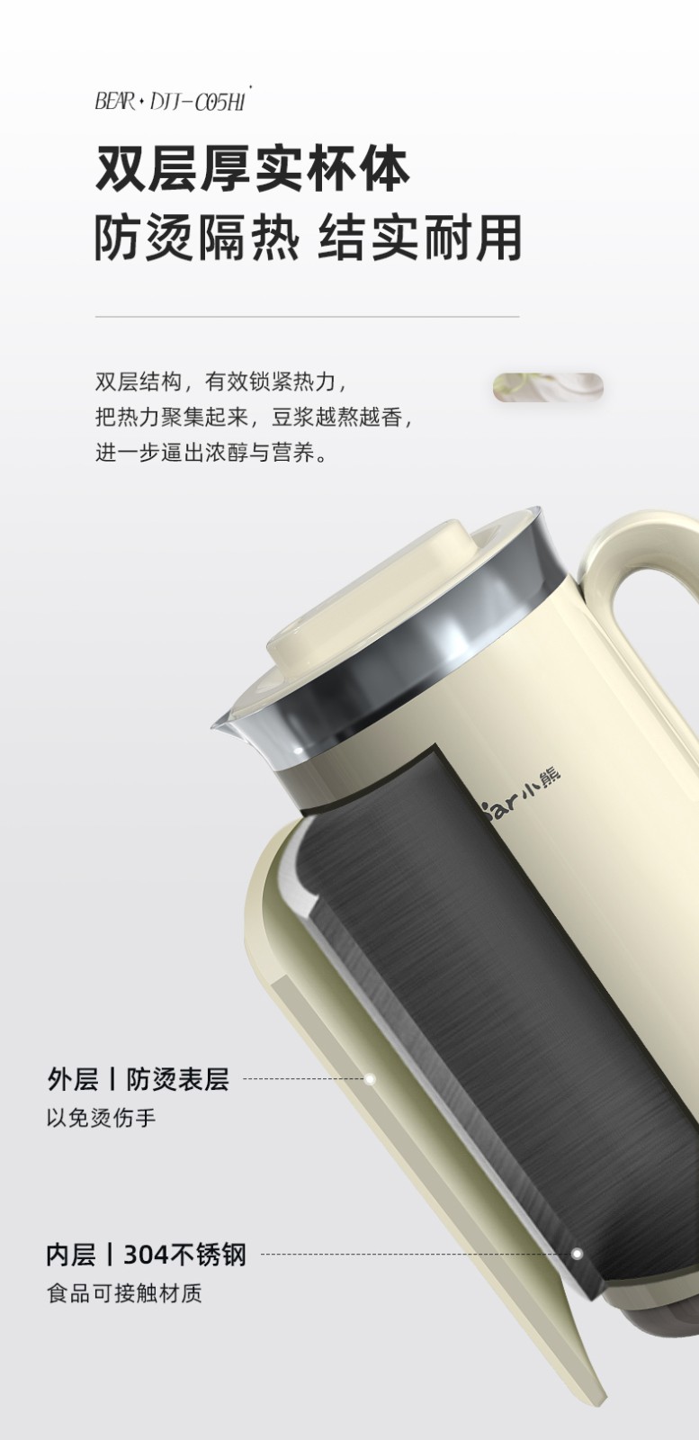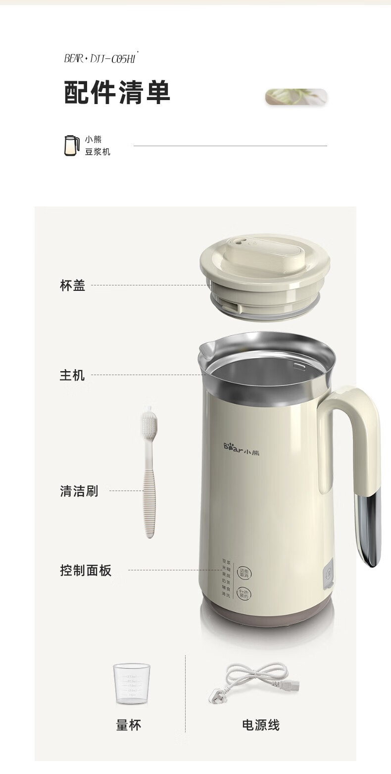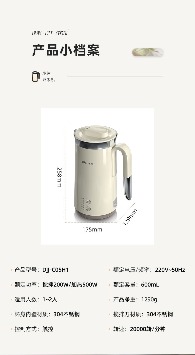小熊(Bear) 豆?jié){機(jī) 迷你破壁機(jī)家用小型米糊機(jī)1-2人食多功能全自動(dòng)免清洗免過濾 DJJ-C05H1 預(yù)約定時(shí)+長效保溫 自營