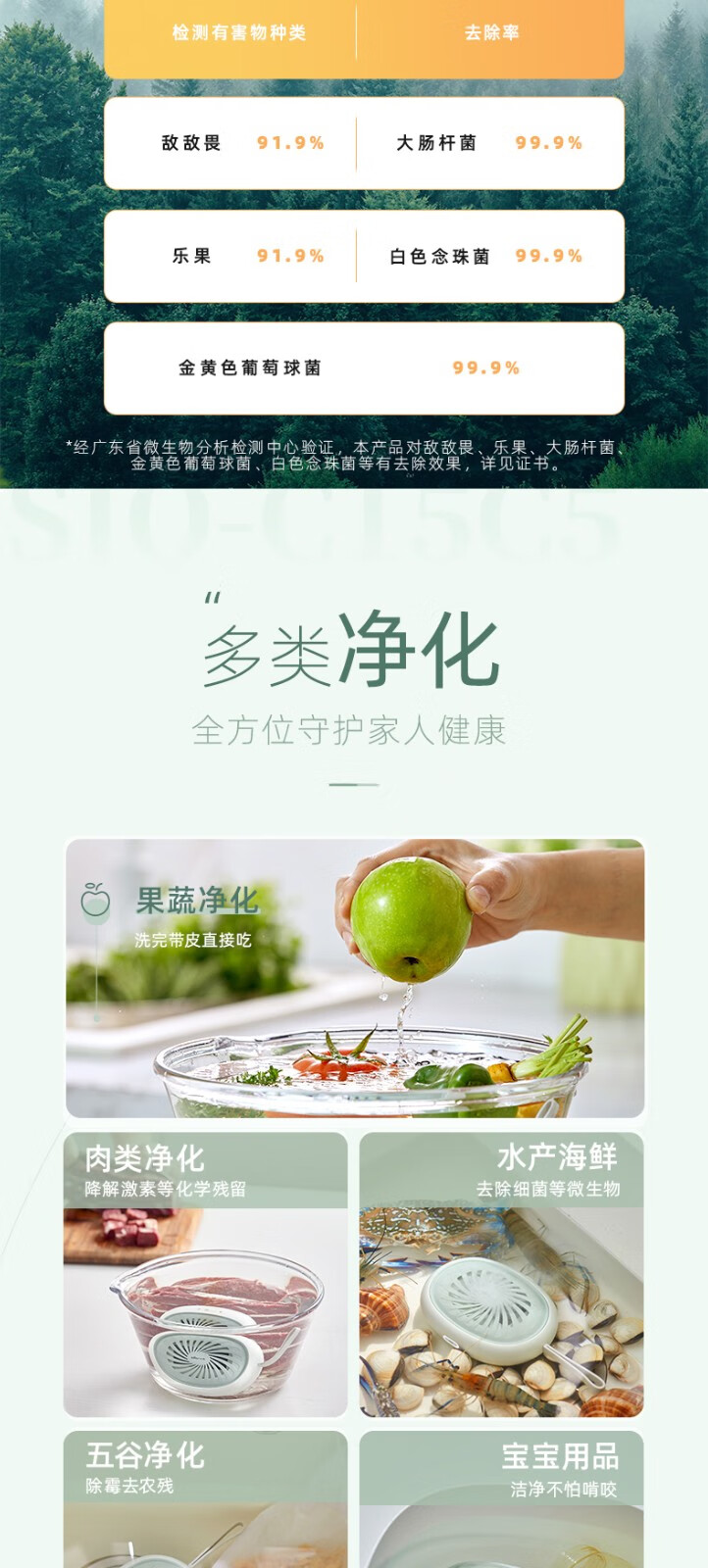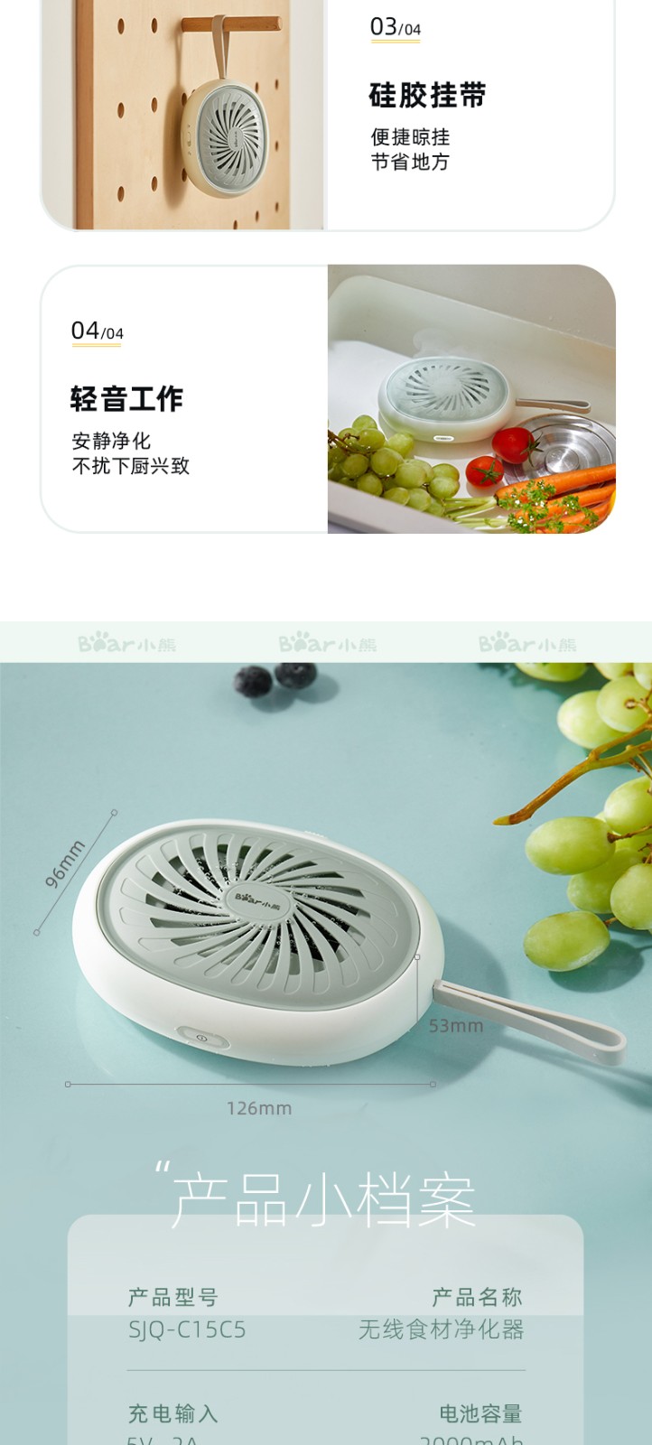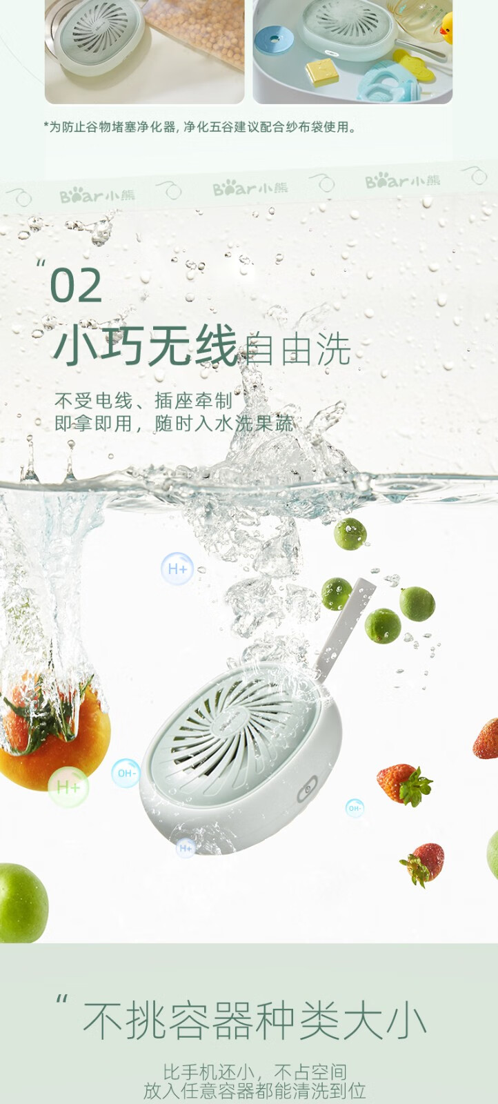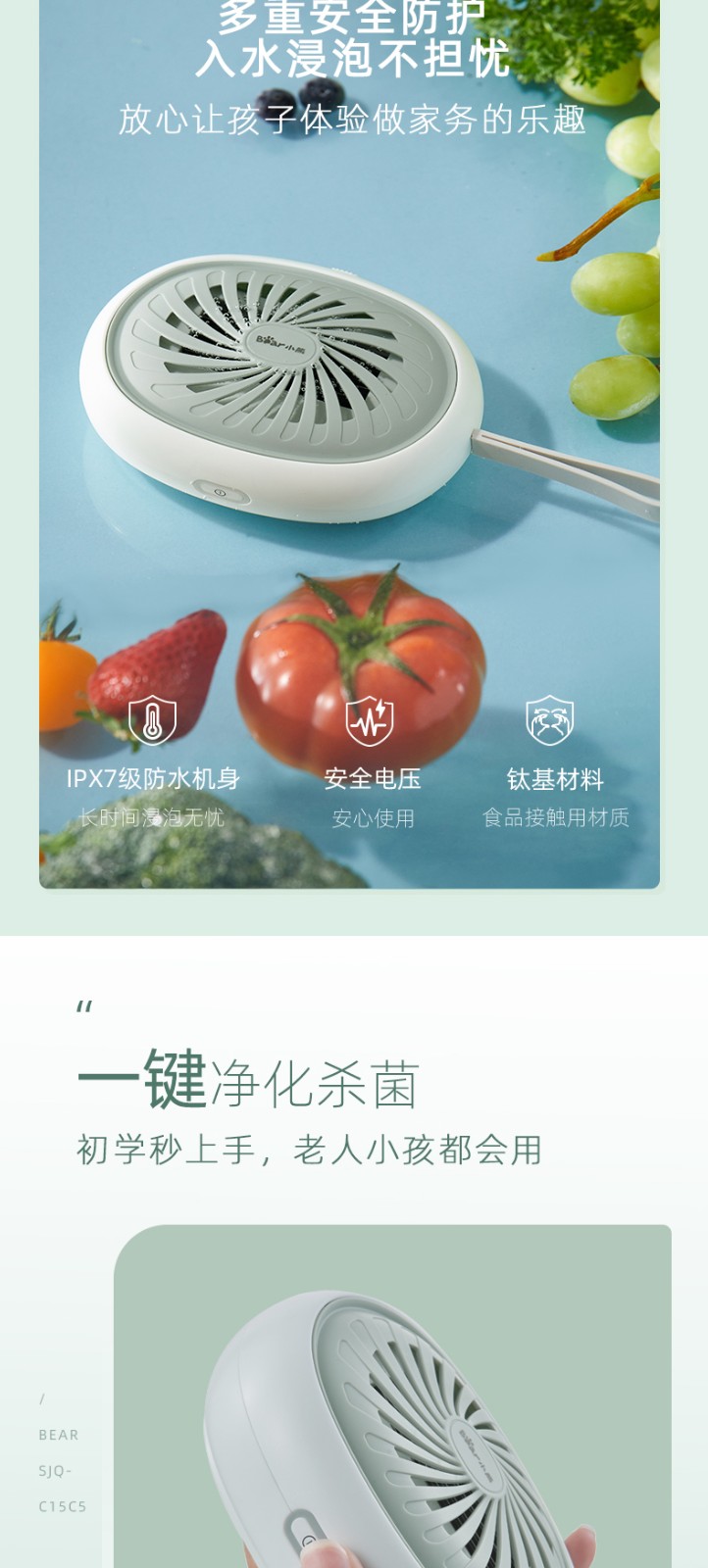 小熊(Bear)洗菜機便攜果蔬消毒清洗機多功能智能食品解毒食材凈化機水果食品消毒凈化器果蔬清洗機 SJQ-C15C5 自營