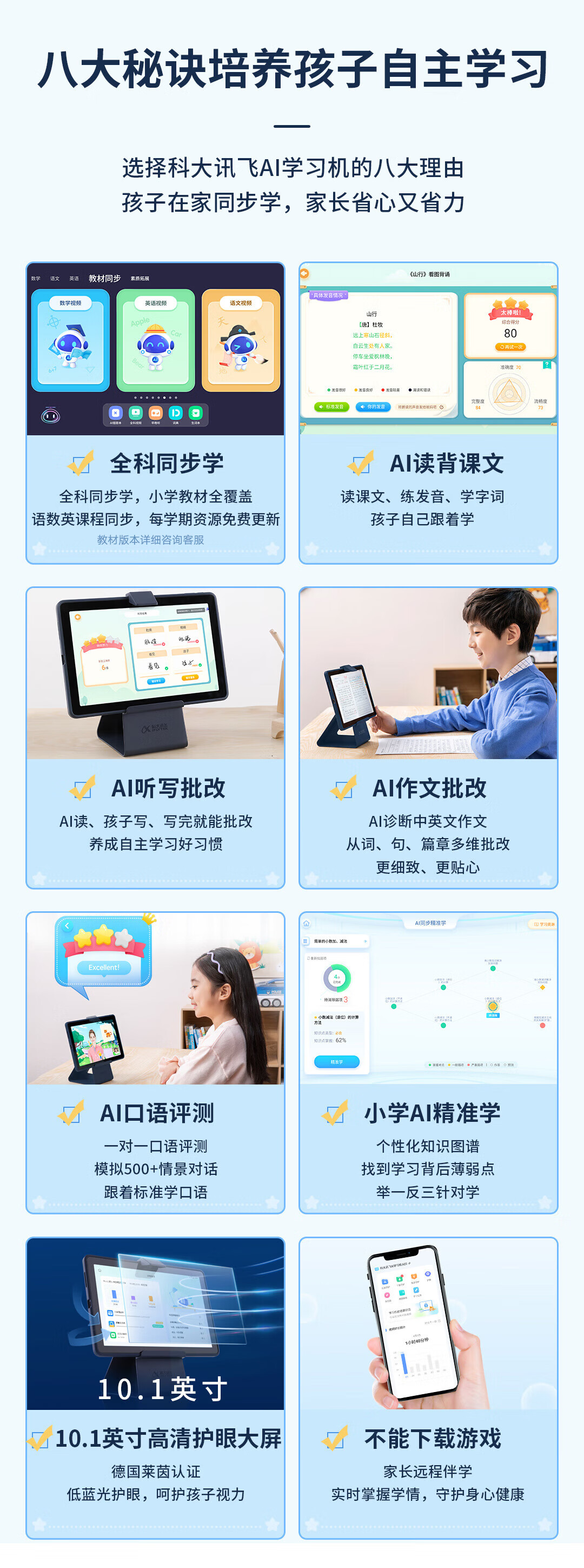 科大訊飛AI學習機A10 4+64GB 10.1英寸 護眼平板電腦 學生平板 英語學習機平板 家教機 個性化精準學習 自營