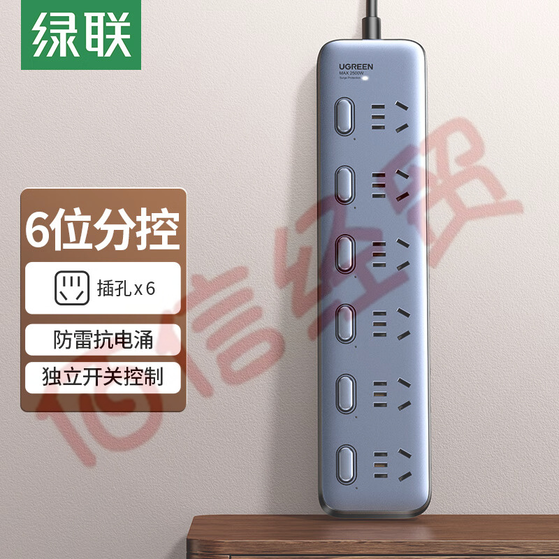 綠聯(lián) 新國標(biāo)6位分控防雷插座 抗電涌防電涌插線板/插排/排插/插板/接線板/拖線板 獨立開關(guān)全長2米 90861 自營