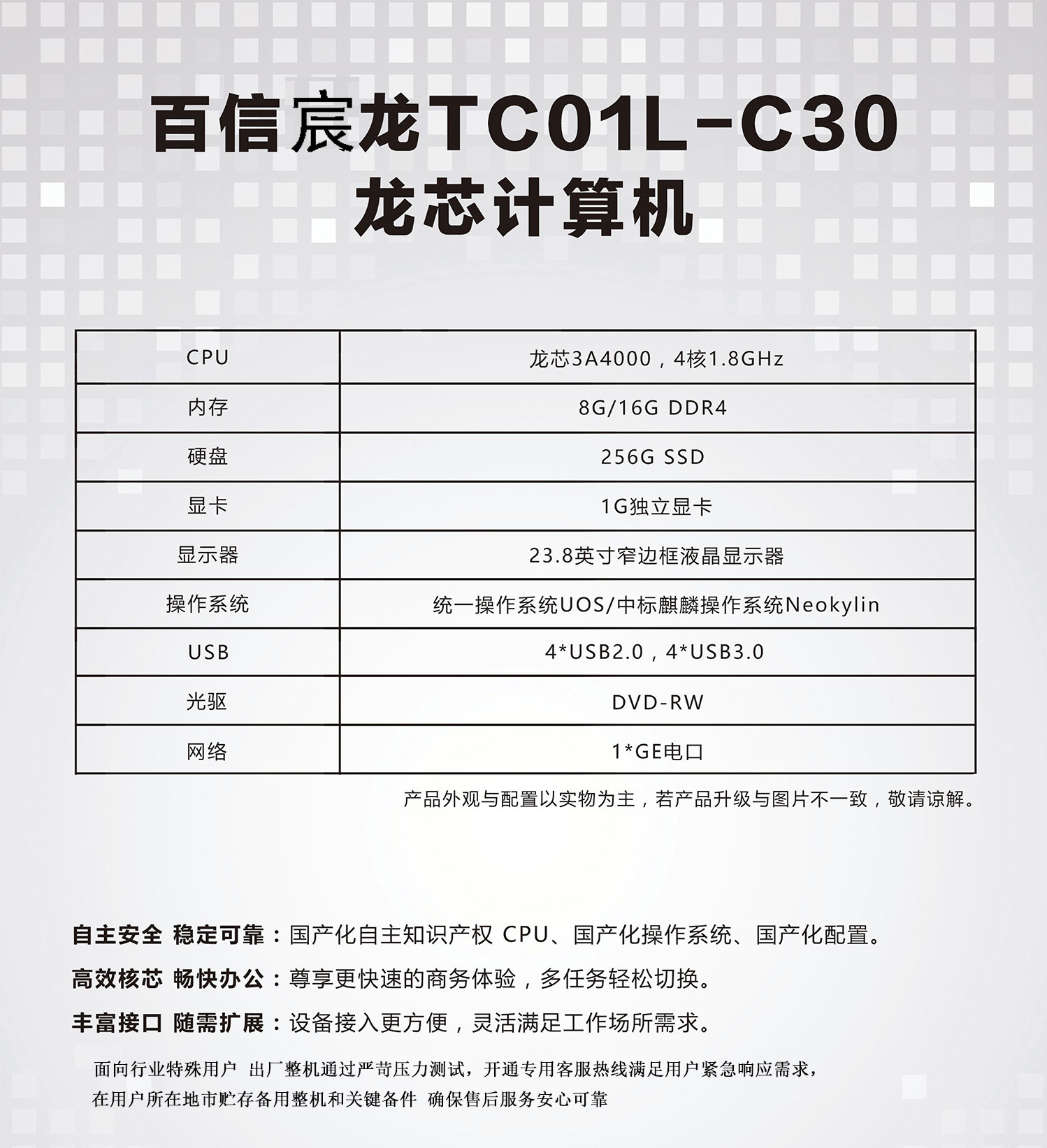 百信宸龍TC01L-C30 商用國產(chǎn)臺(tái)式電腦 龍芯3A 4000/8G /256SSD /1G /DVDRW /單主機(jī)(含統(tǒng)信正版系統(tǒng)) 自營