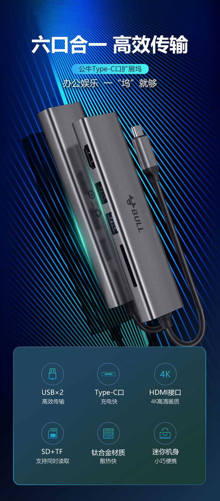 公牛(BULL)華為蘋果電腦轉(zhuǎn)換器 macbookpro筆記本hdmi轉(zhuǎn)接頭usb六合一擴(kuò)展塢GNV-JH1506 自營(yíng)
