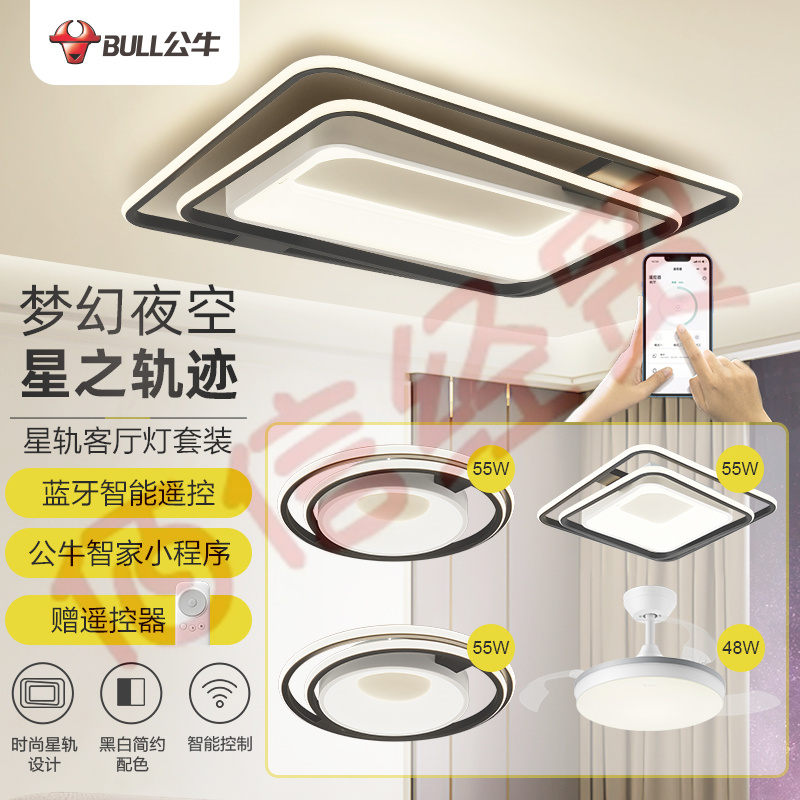 公牛(BULL)LED吸頂燈X35星軌系列MX-M130A-CD小程序控制無極調(diào)光三檔調(diào)色 客廳燈+方形燈+圓形燈*2+風(fēng)扇 自營
