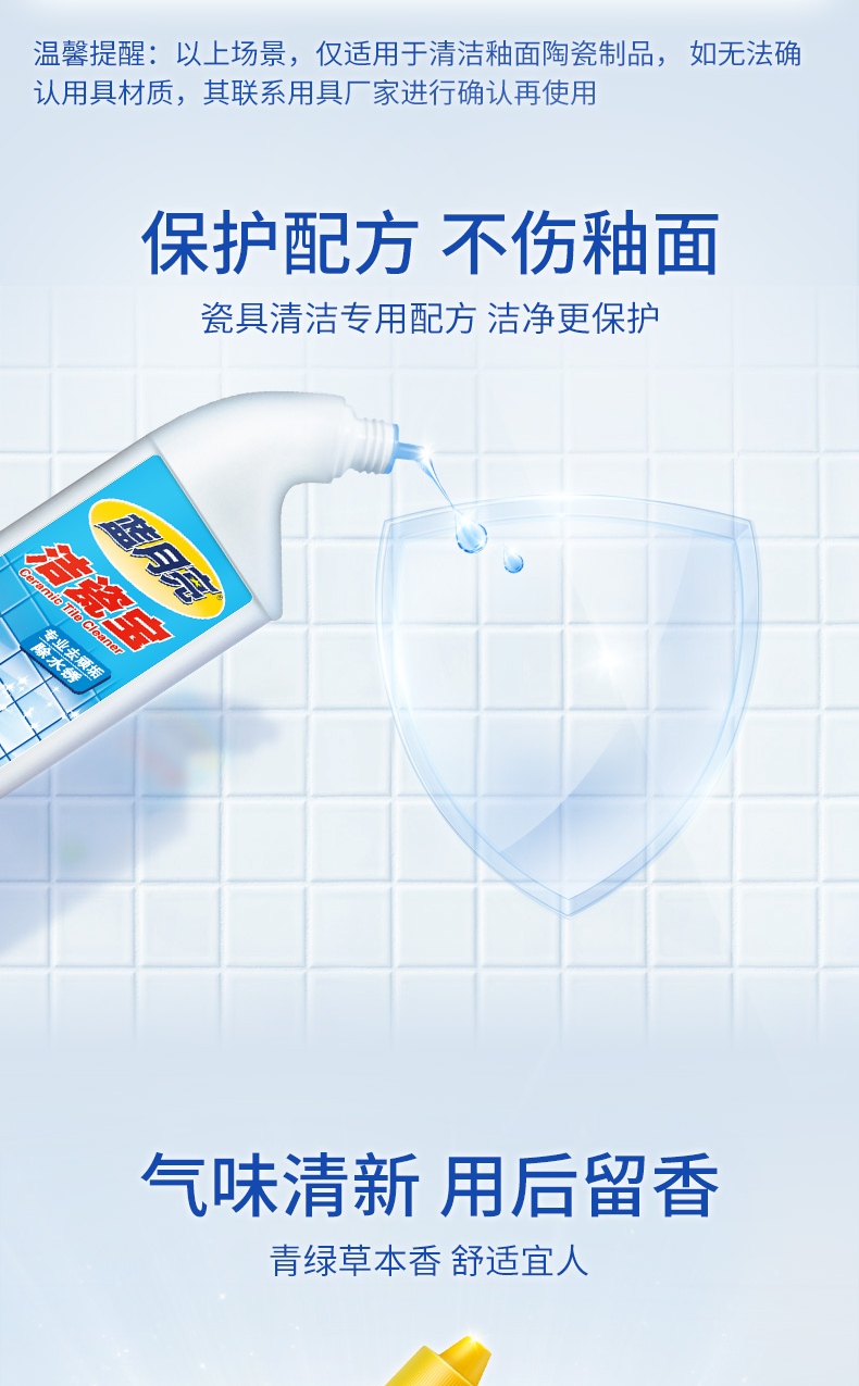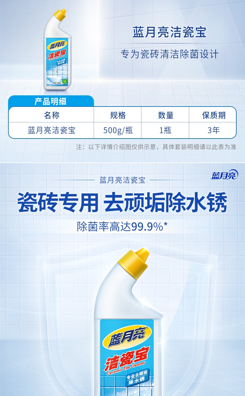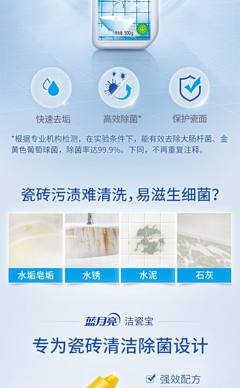藍月亮 潔瓷寶--地板清潔劑 瓷磚洗臉池清潔劑潔瓷劑500g瓶裝 地板瓷磚清潔速除菌劑 12瓶/箱(單瓶價)(整箱售) 自營