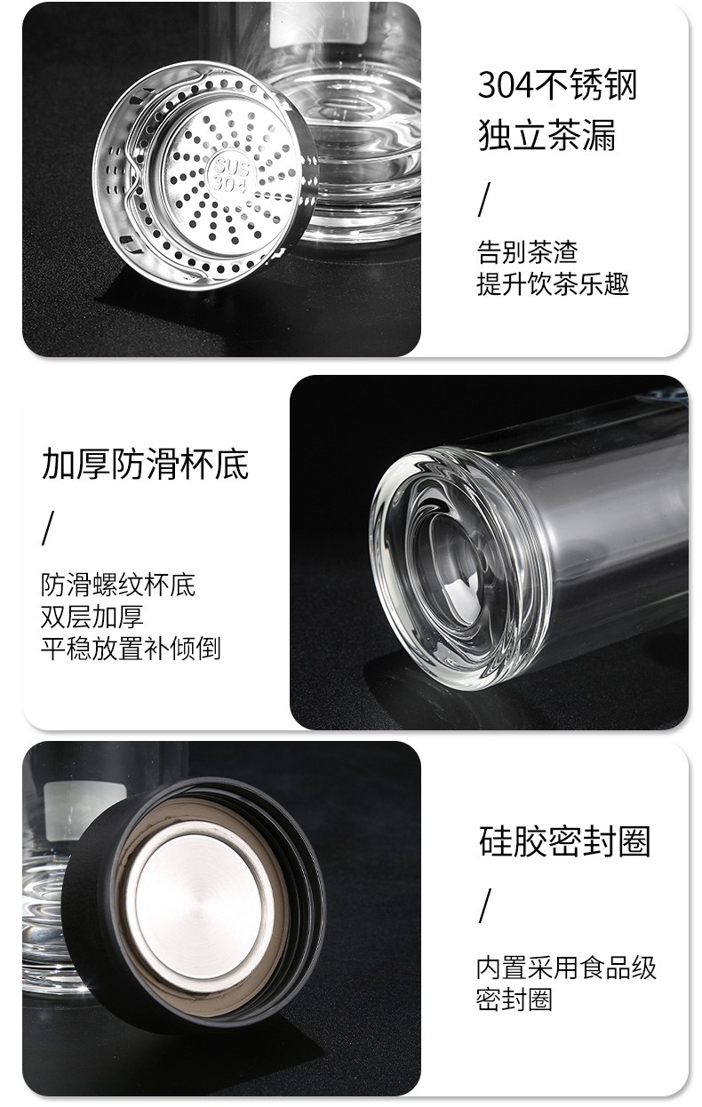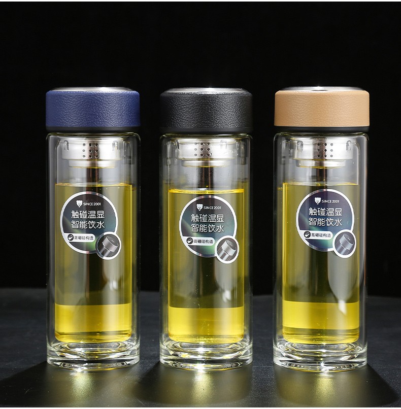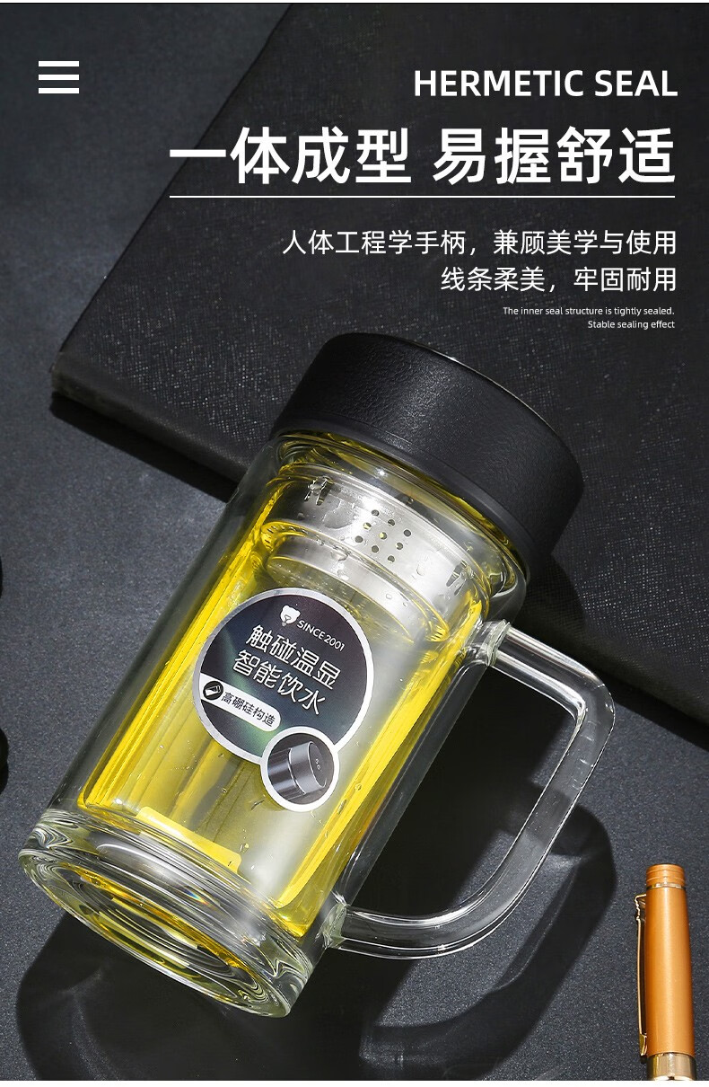匡迪(DKADI) 匡迪雙層玻璃杯茶水分離泡茶杯子智能溫顯耐熱商務(wù)辦公室水杯男 皮紋黑色 300ml手柄款+智能杯蓋 自營
