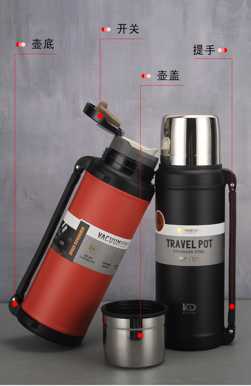 匡迪(DKADI) 新款匡迪不銹鋼保溫壺內(nèi)外304旅行壺戶外運(yùn)動(dòng)瓶手提大容量 紅色 2000ml 自營(yíng)