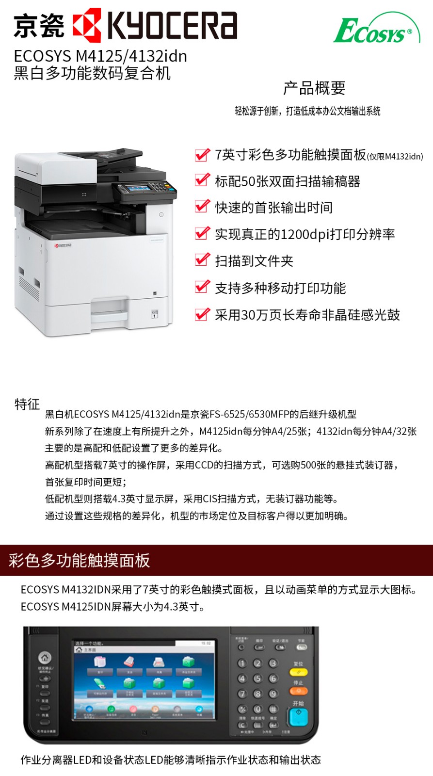 ¥12609.00京瓷 (Kyocera) ECOSYS M4226idn A3黑白多功能數(shù)碼復(fù)合機(jī) 標(biāo)配含輸稿器+無(wú)線(xiàn)網(wǎng)卡