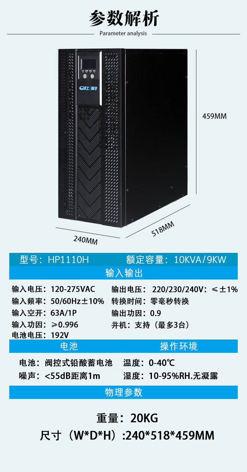 商宇UPS不間斷電源HP1110H機房服務(wù)器穩(wěn)壓10KVA/9KW斷電備用電源30分鐘-8小時套餐 續(xù)航8小時64節(jié)商宇100AH蓄電池2套A32柜 自營