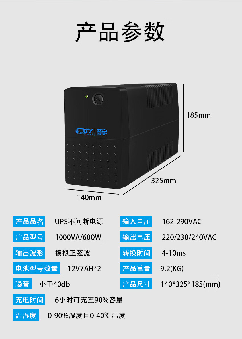 商宇(CPSY) S1000 UPS不間斷電源后備式1KVA/600W辦公電腦斷電續(xù)航60分鐘 自營