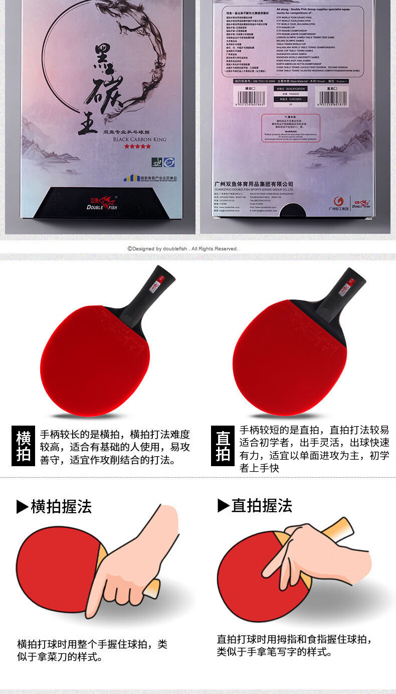 雙魚黑紅碳王乒乓球拍 碳纖維乒乓球拍 快攻型球拍 紅碳王五星 乒乓球拍橫拍(1支)