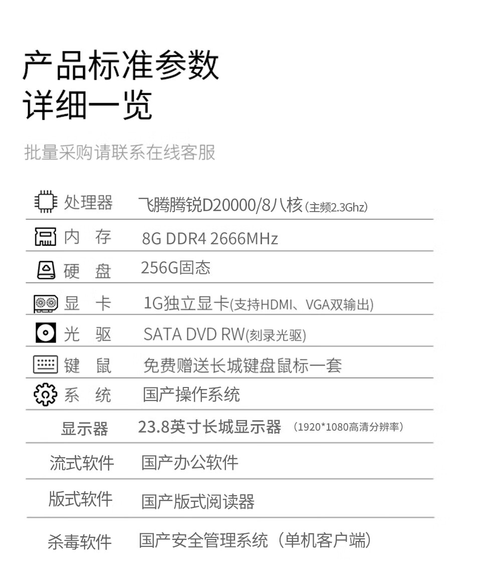 長城 世恒TD120A2 商用辦公臺(tái)式機(jī)電腦主機(jī)CPU系統(tǒng)+軟件(D2000八核+8G+256G)23.8英寸 自營
