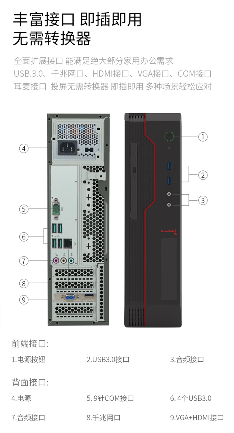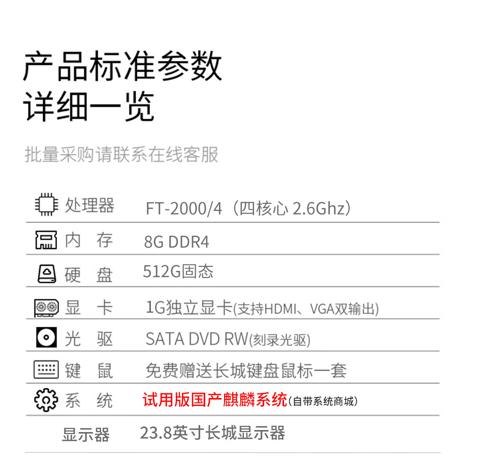 長(zhǎng)城 世恒DF716商用辦公臺(tái)式機(jī)電腦主機(jī)(FT-2000/4四核+8G+512G)23.8英寸 自營(yíng)